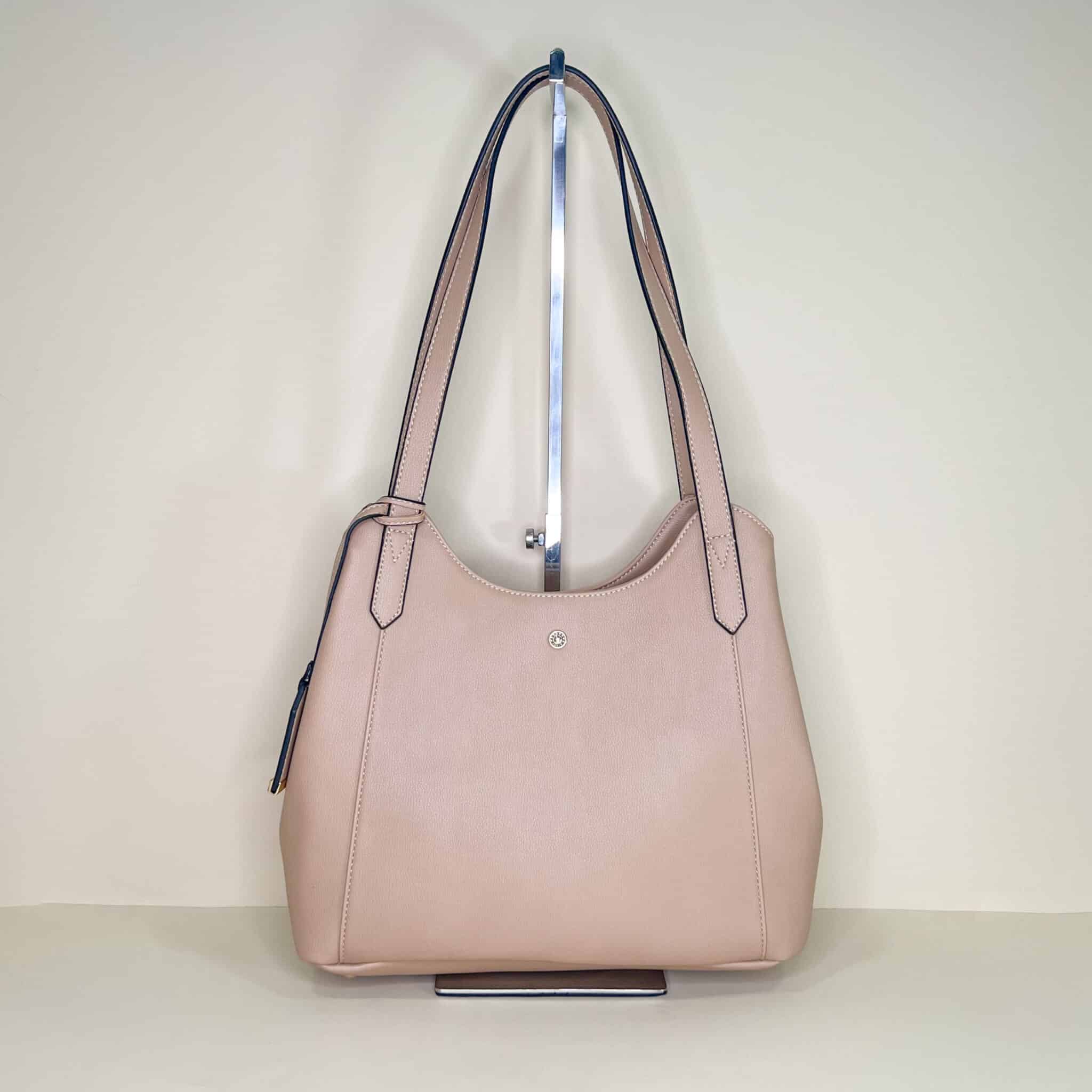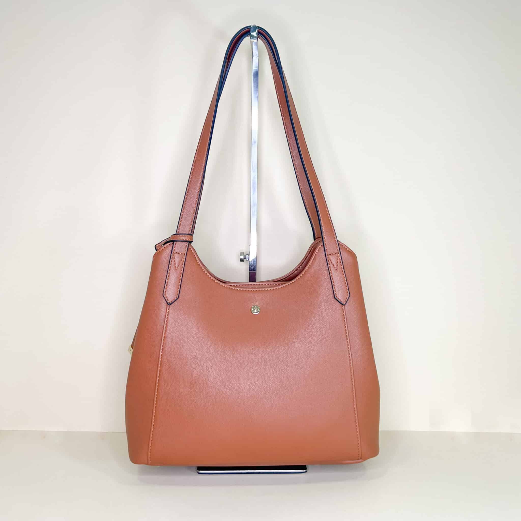 Borsa in ecopelle con doppio manico da spalla. Interno organizzato in 3 scomparti comoda e spaziosa.