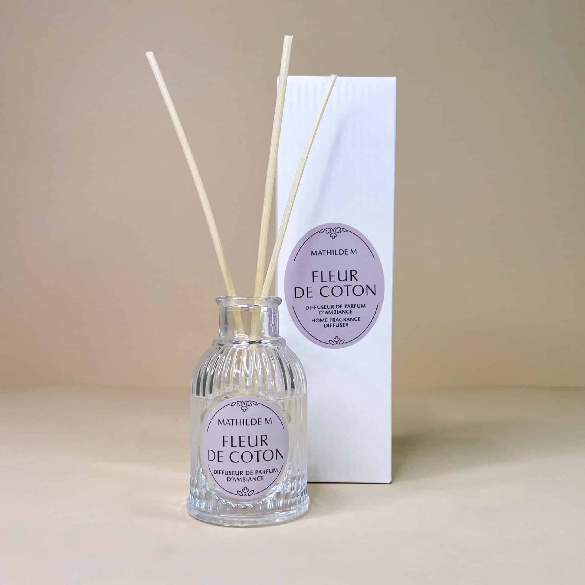 Diffusore di profumo, essenza, profumatore ambiente con bastoncini essenza Fiori di cotone 90 ml, con boccetta elegante i in vetro.