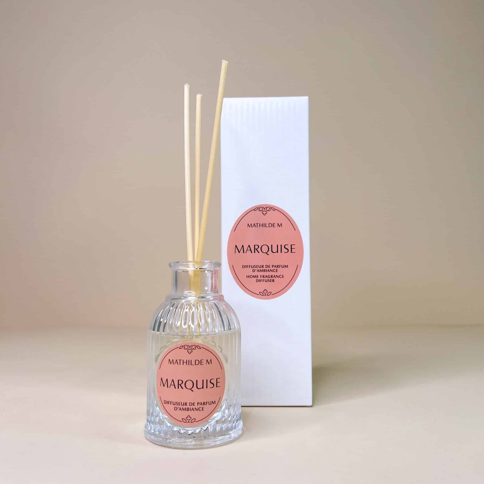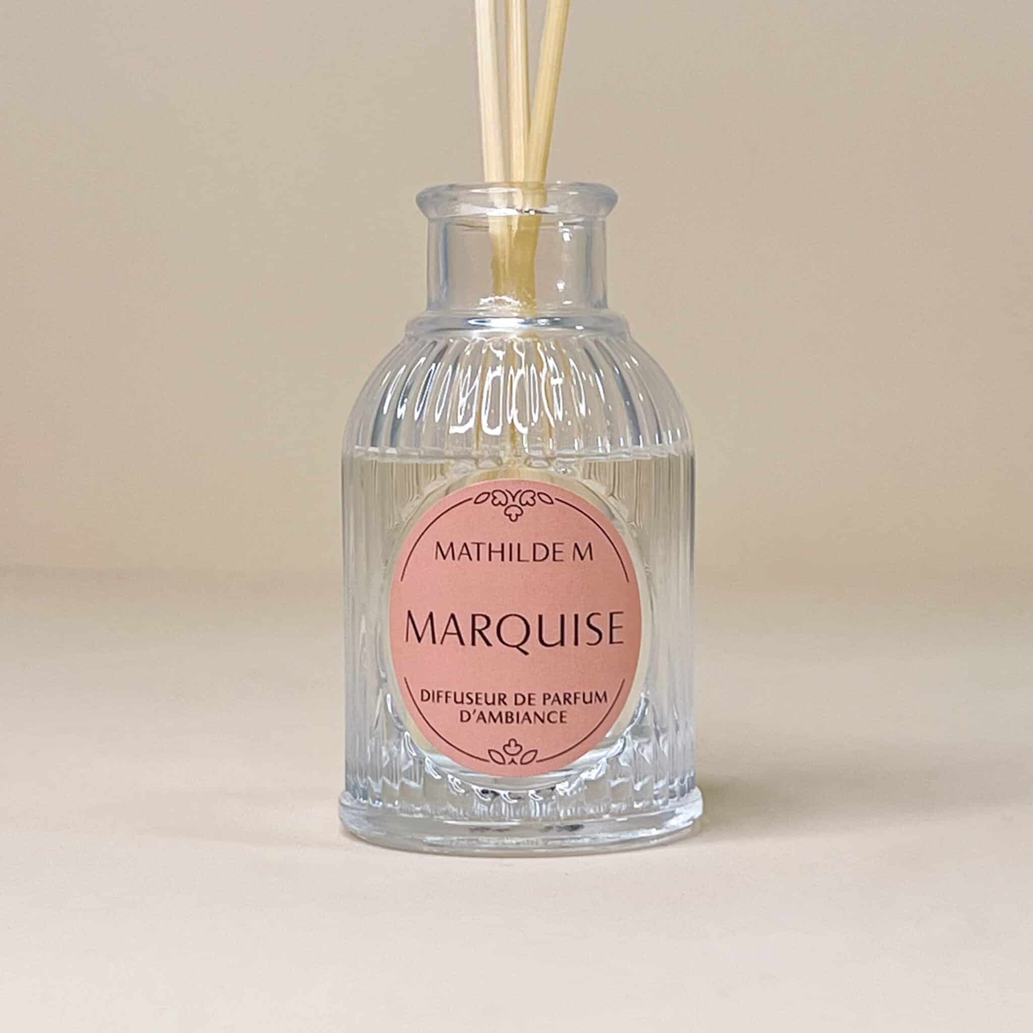 Diffusore di profumo, essenza, profumatore ambiente con bastoncini essenza Marquise 90 ml, con boccetta elegante i in vetro.