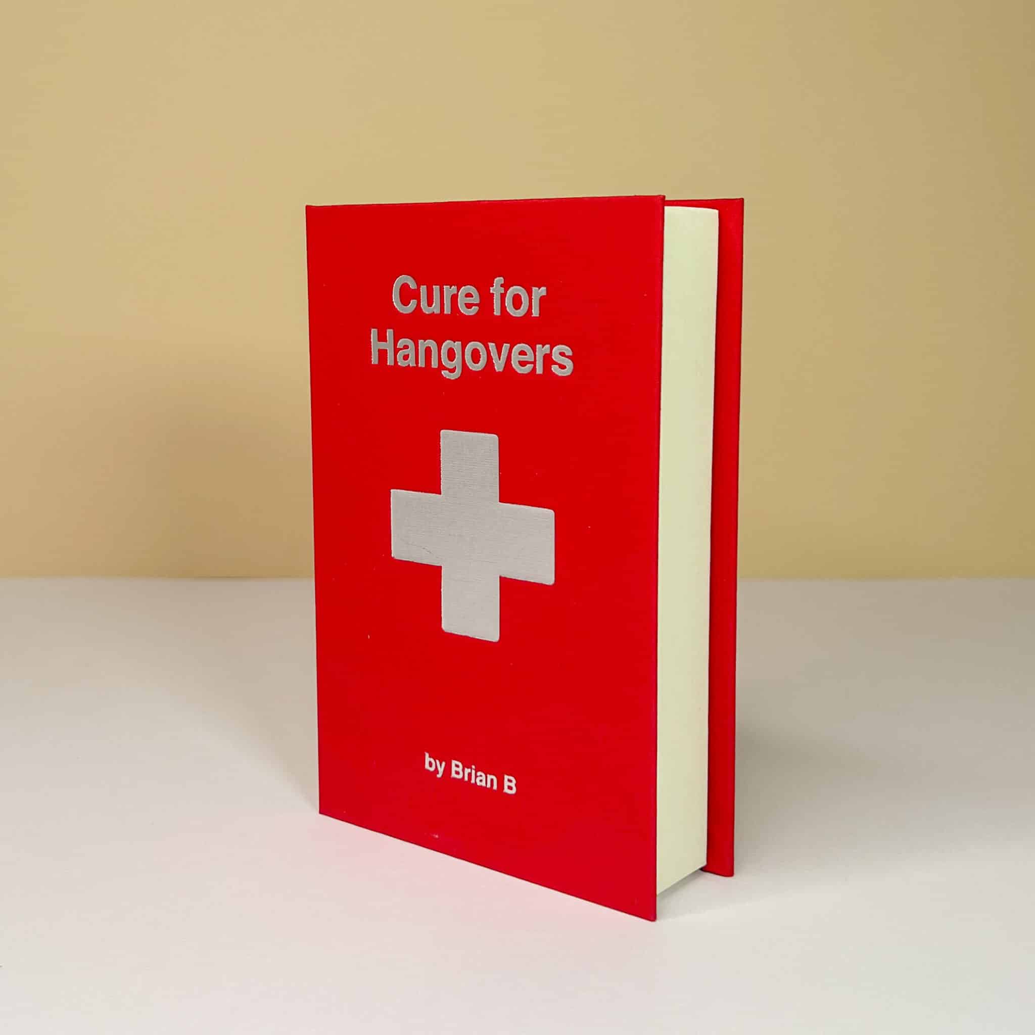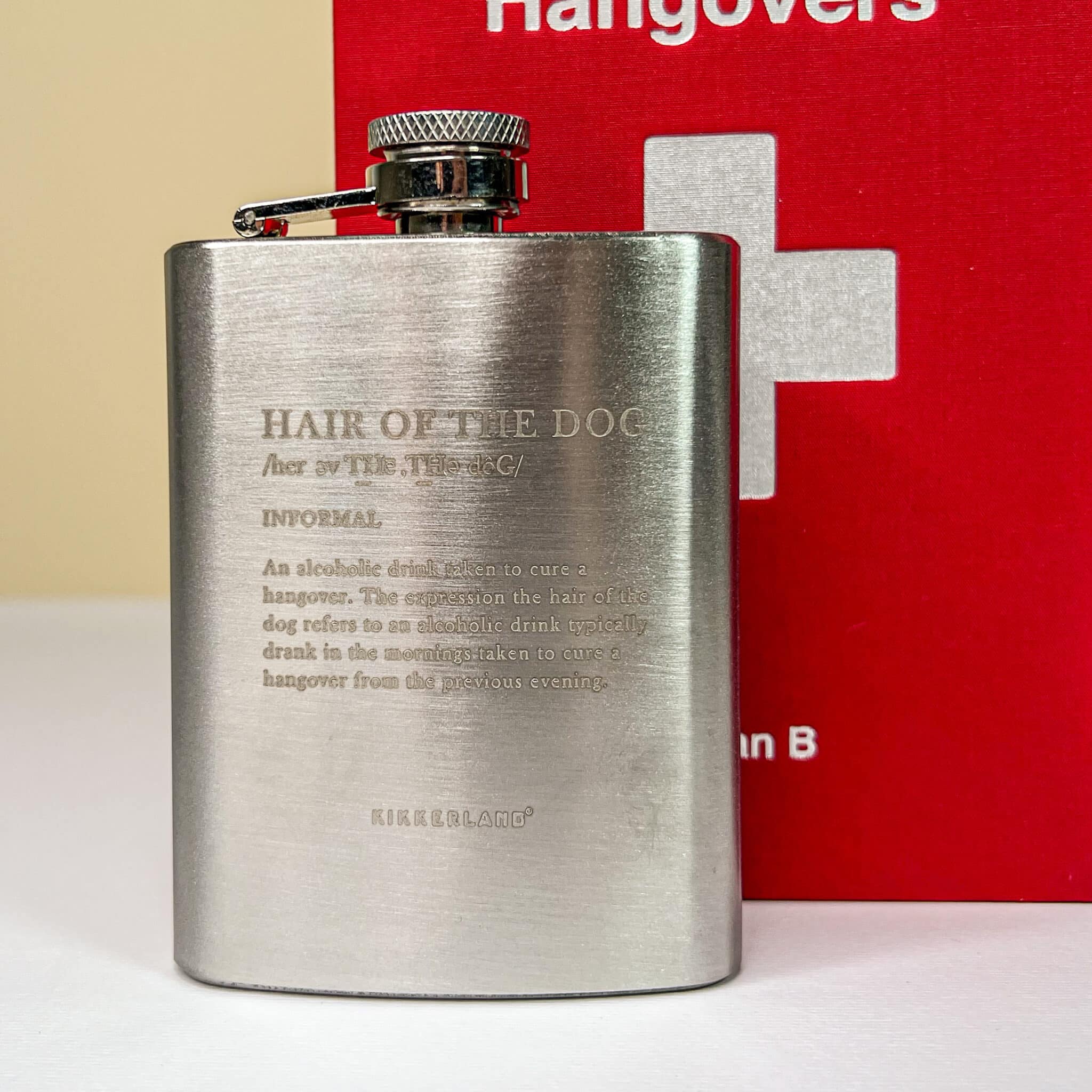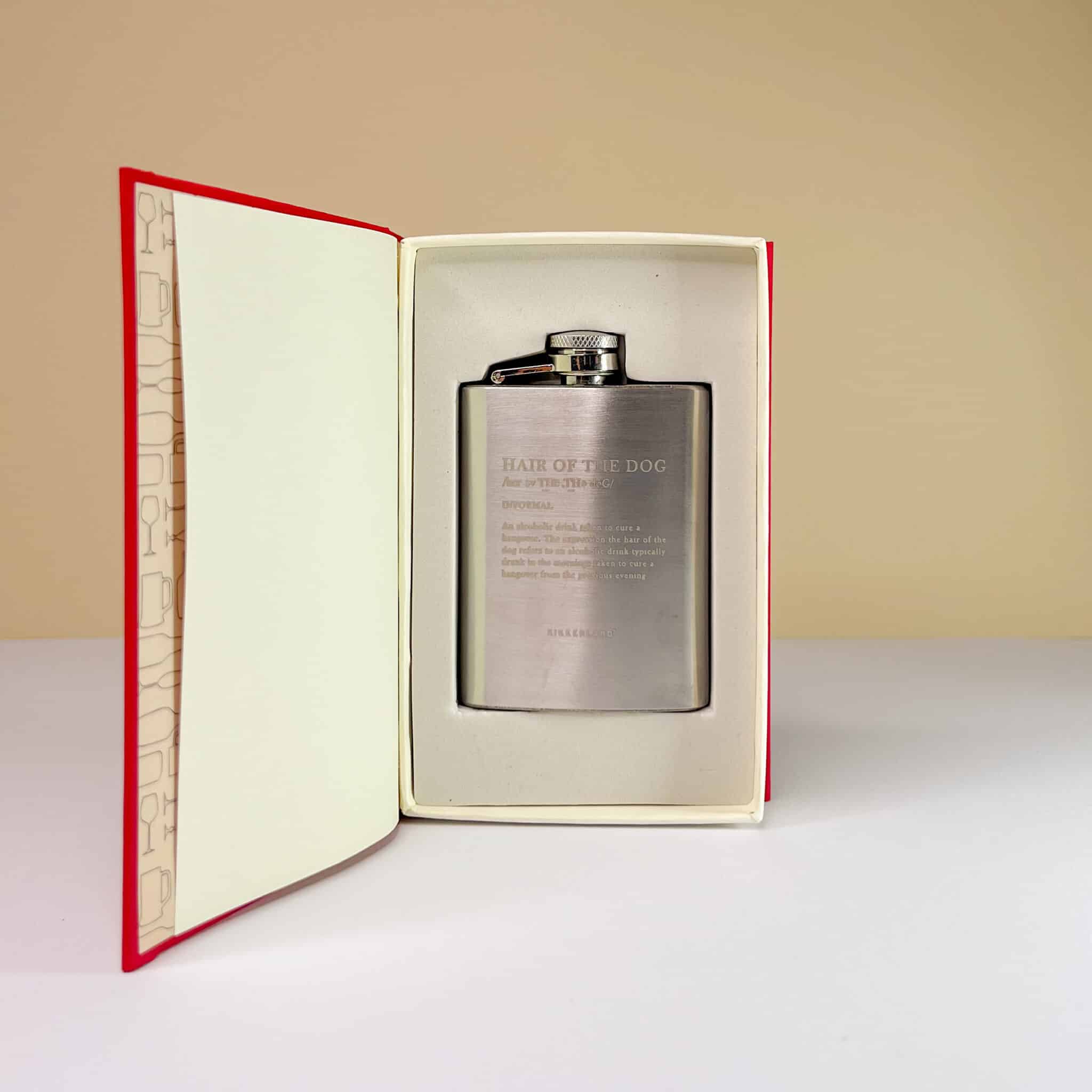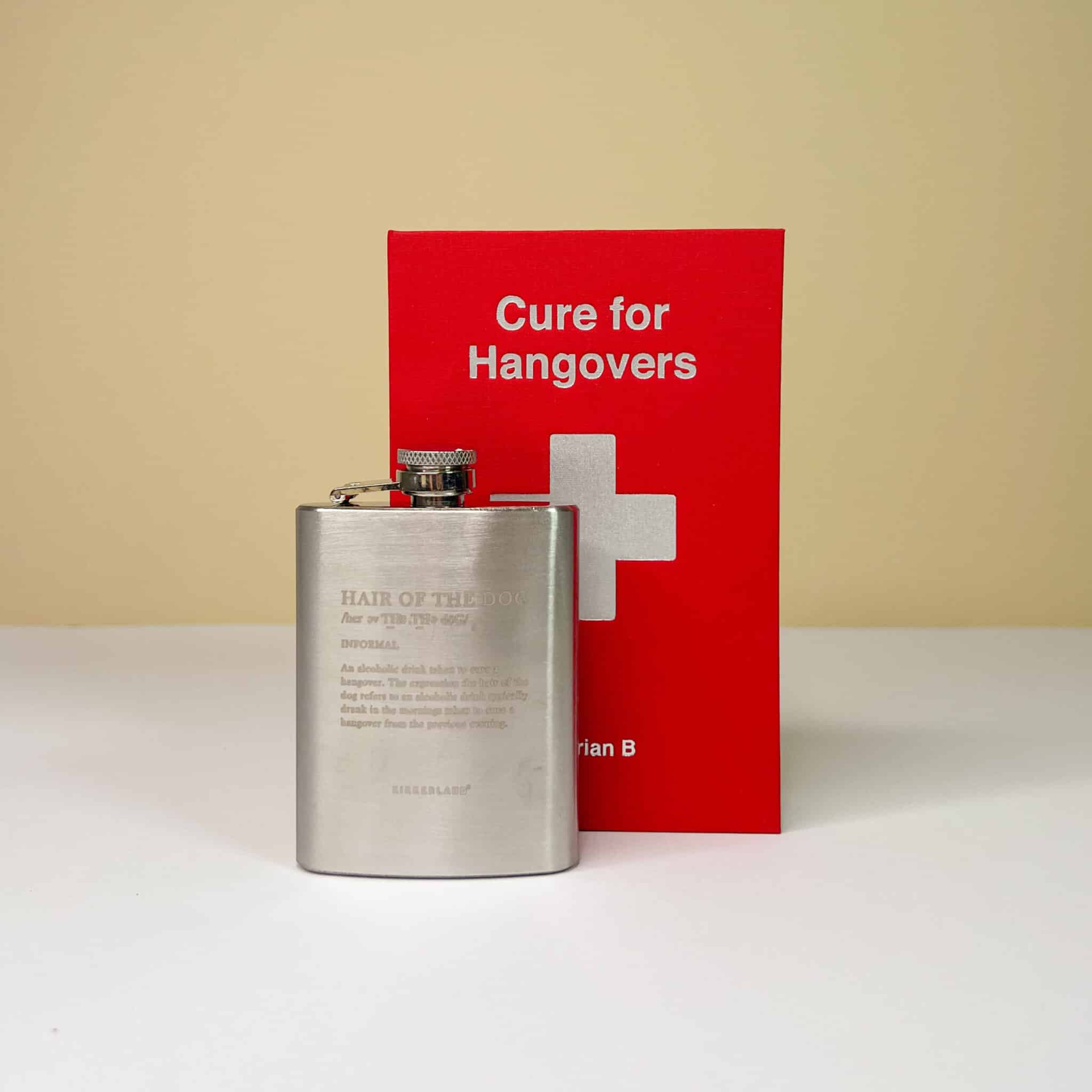 Fiaschetta Hangover: finto libricino rosso cassetta del pronto soccorso con all’interno una fiaschetta in acciaio con frase ironica divertente contro il post sbornia.