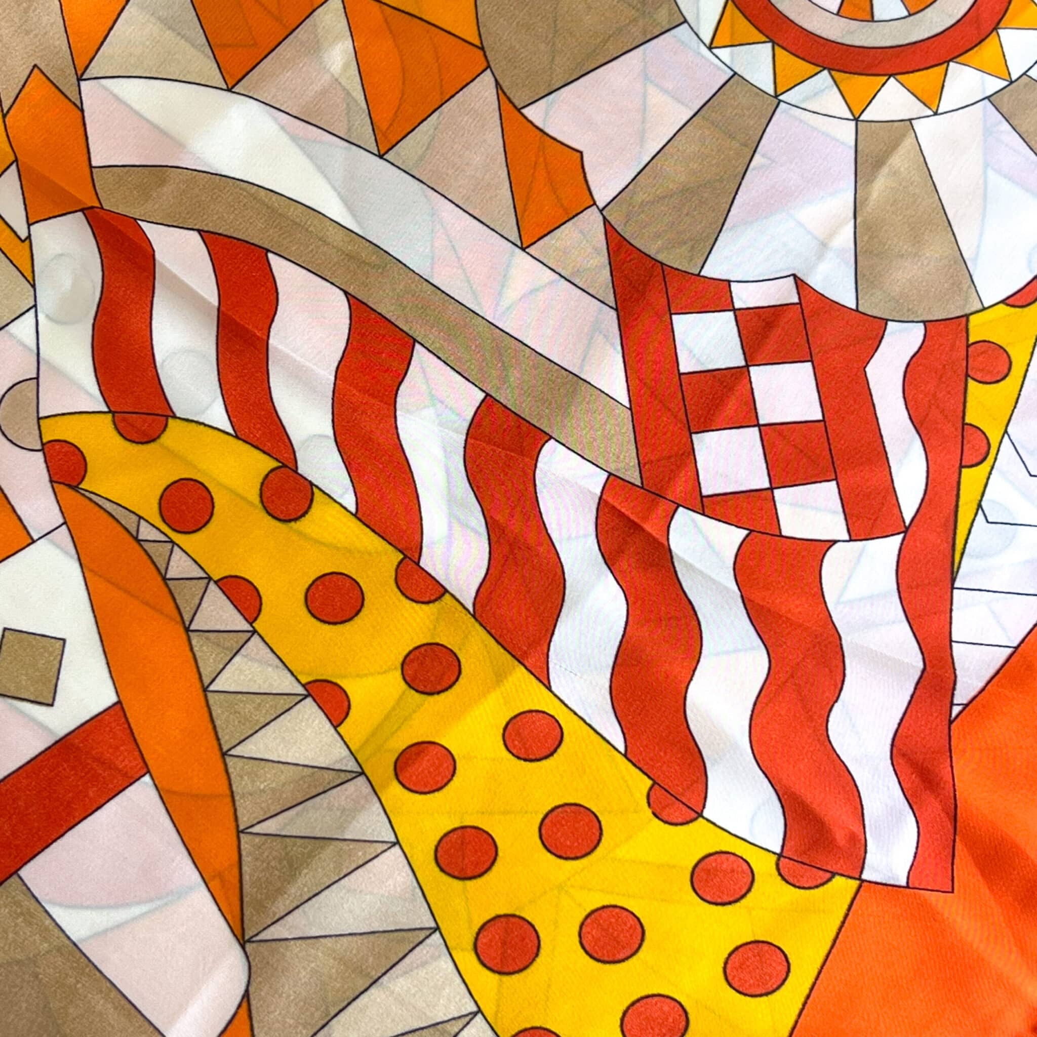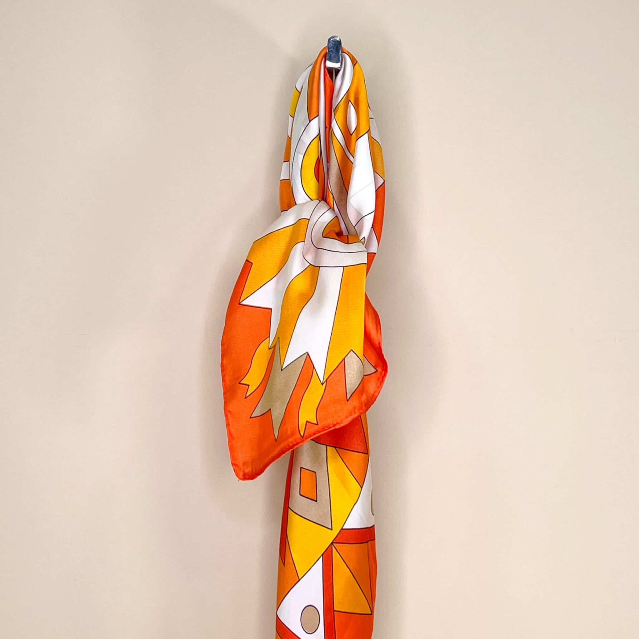 Aggiungi un tocco di glamour e personalità al tuo look con il nostro foulard fantasia astratta arancione e giallo, perfetto per la primavera e l’estate.