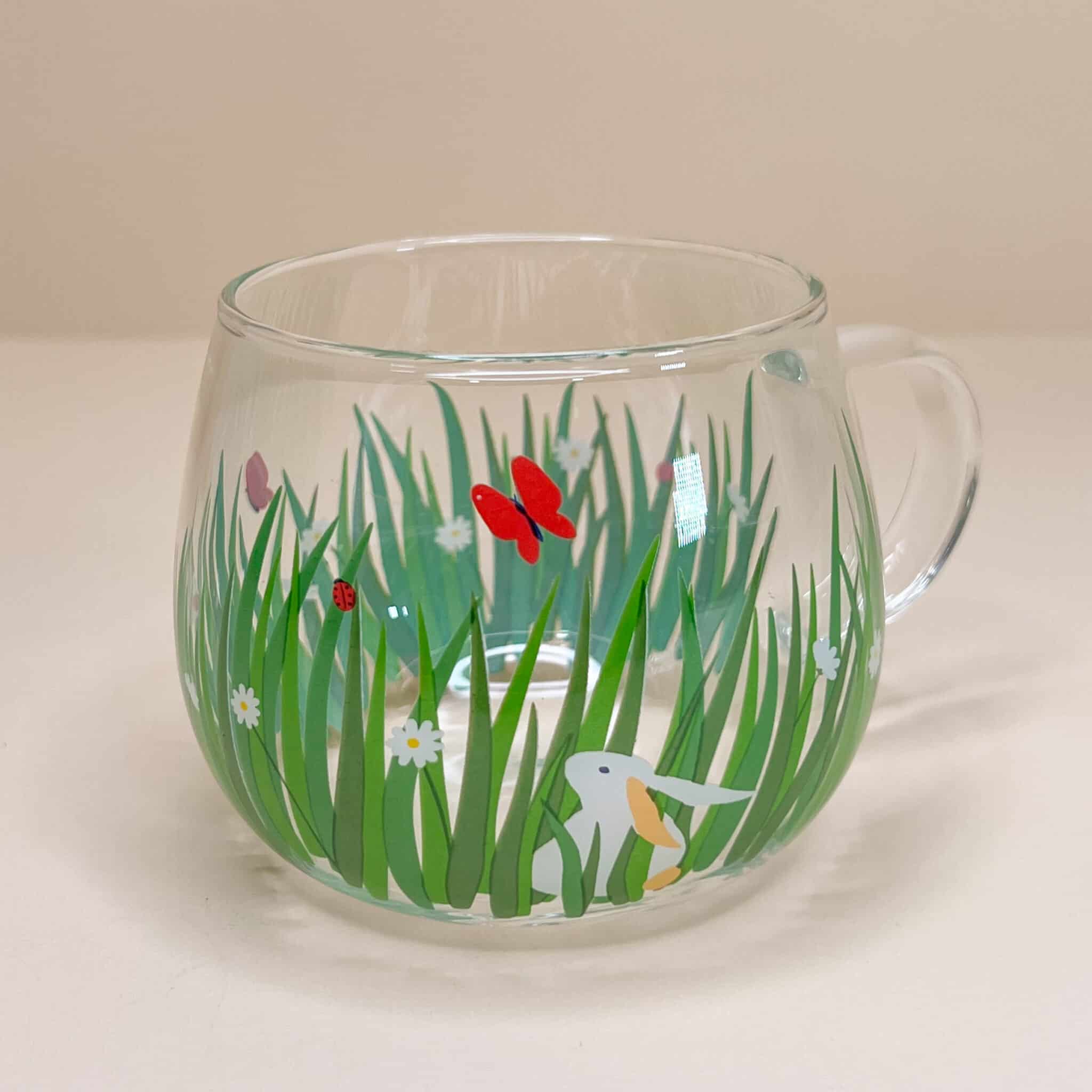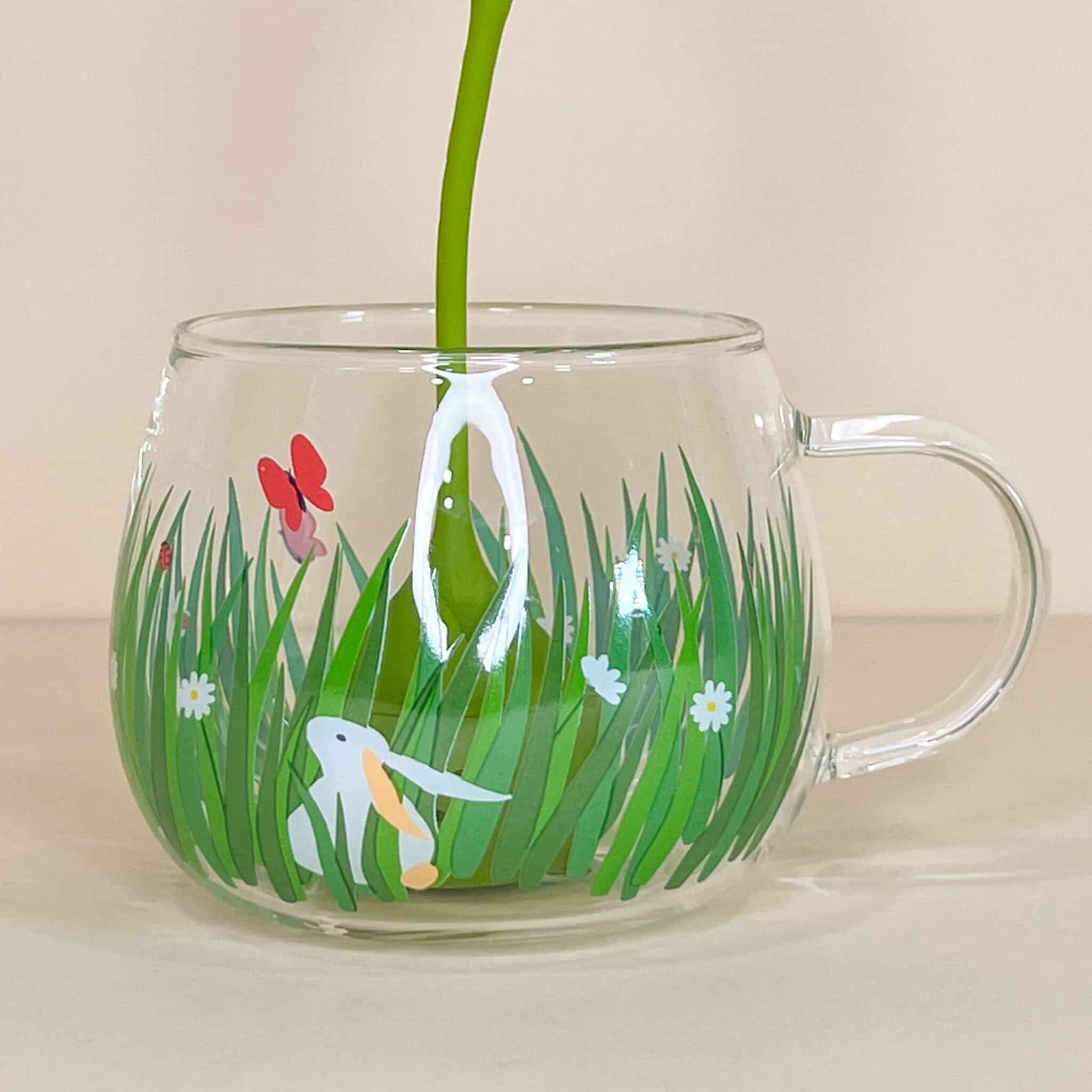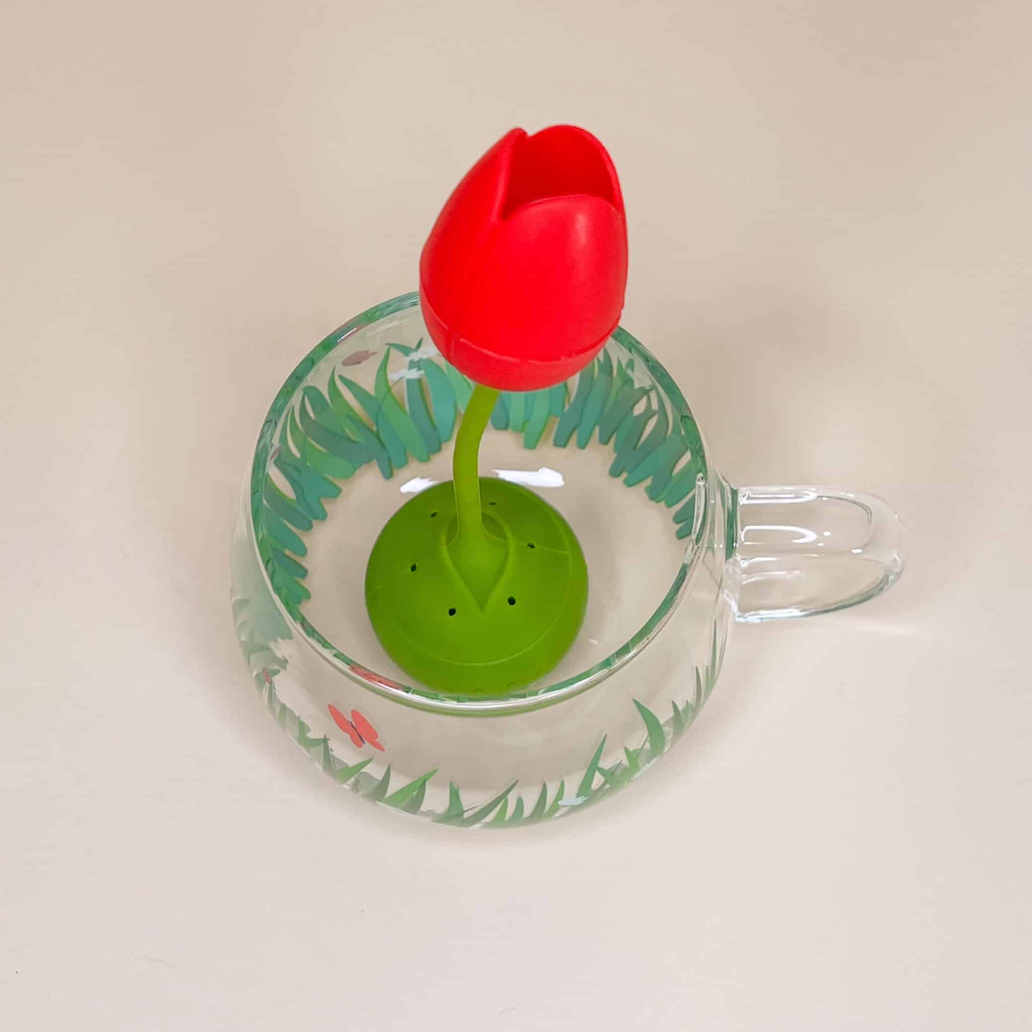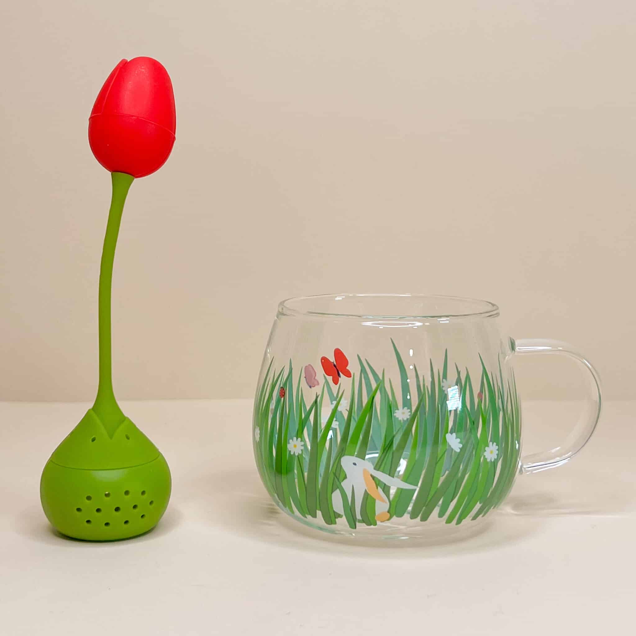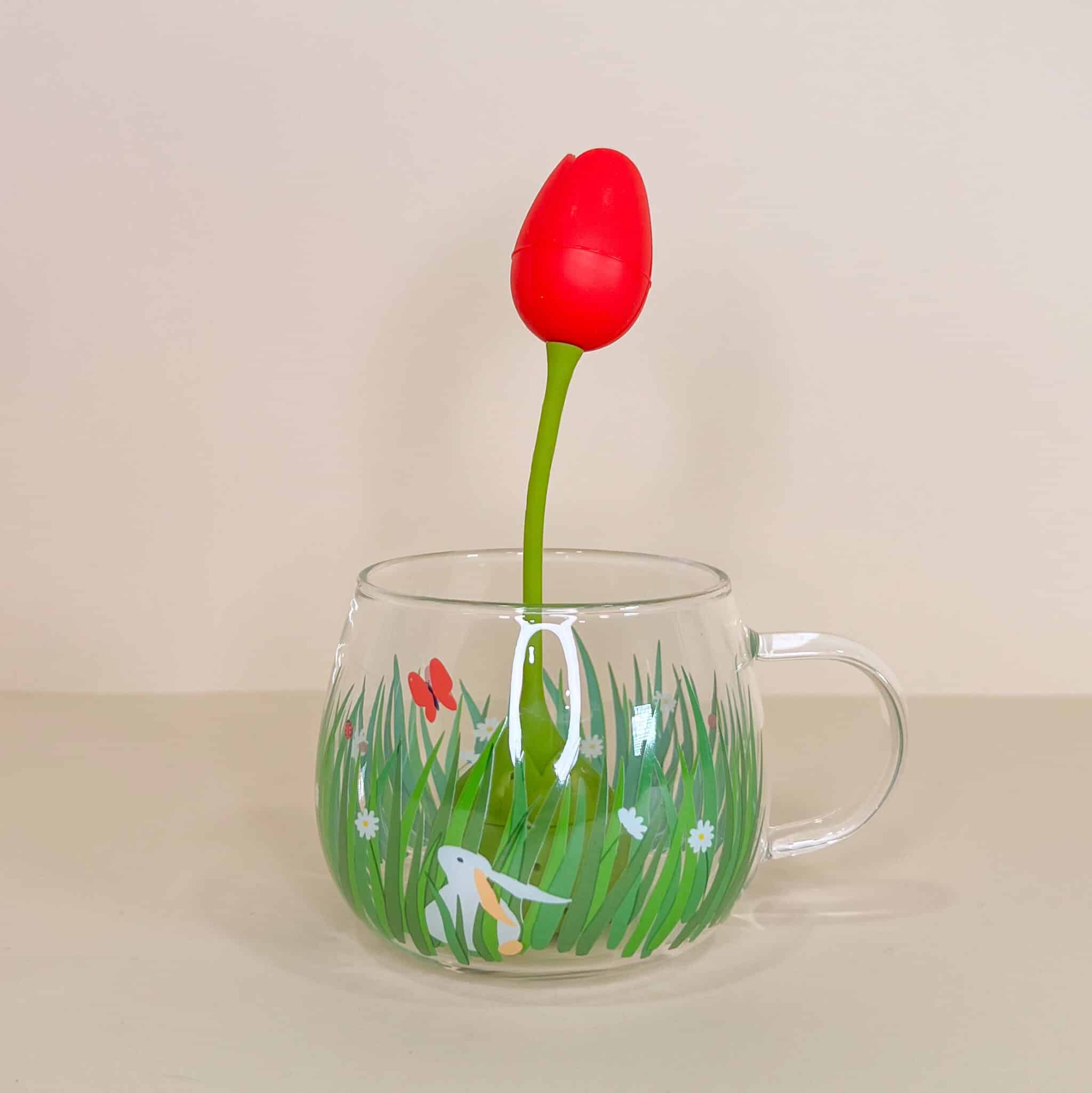 Set infusore per the a forma di tulipano rosso e tazza di vetro con coniglietto e prato fiorito disegnati.
