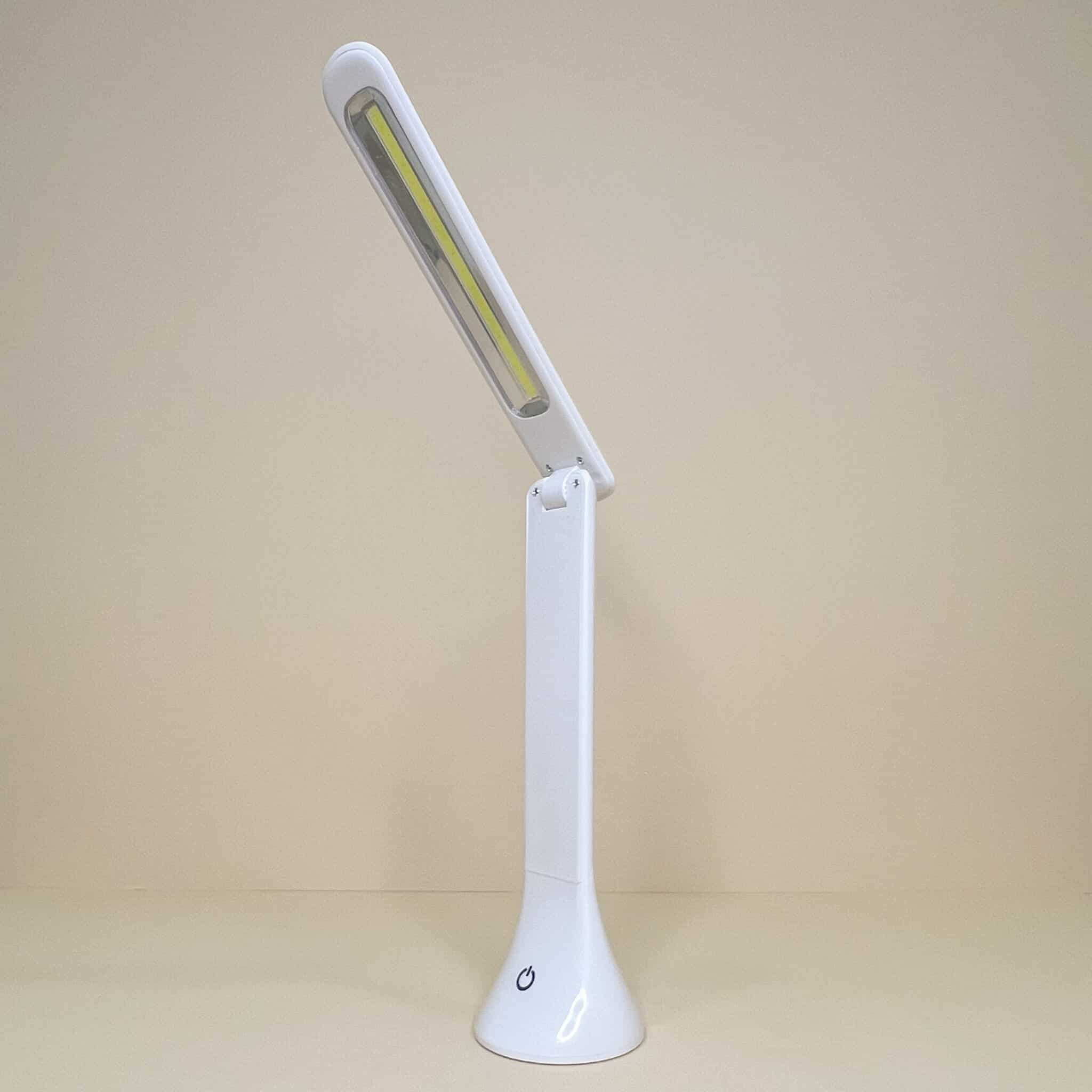 Lampada da tavolo con luce COB con pulsante touch a 3 gradazioni di luce pieghevole funziona o con cavo USB contenuto nella scatola o con 3 batterie AA non incluse.