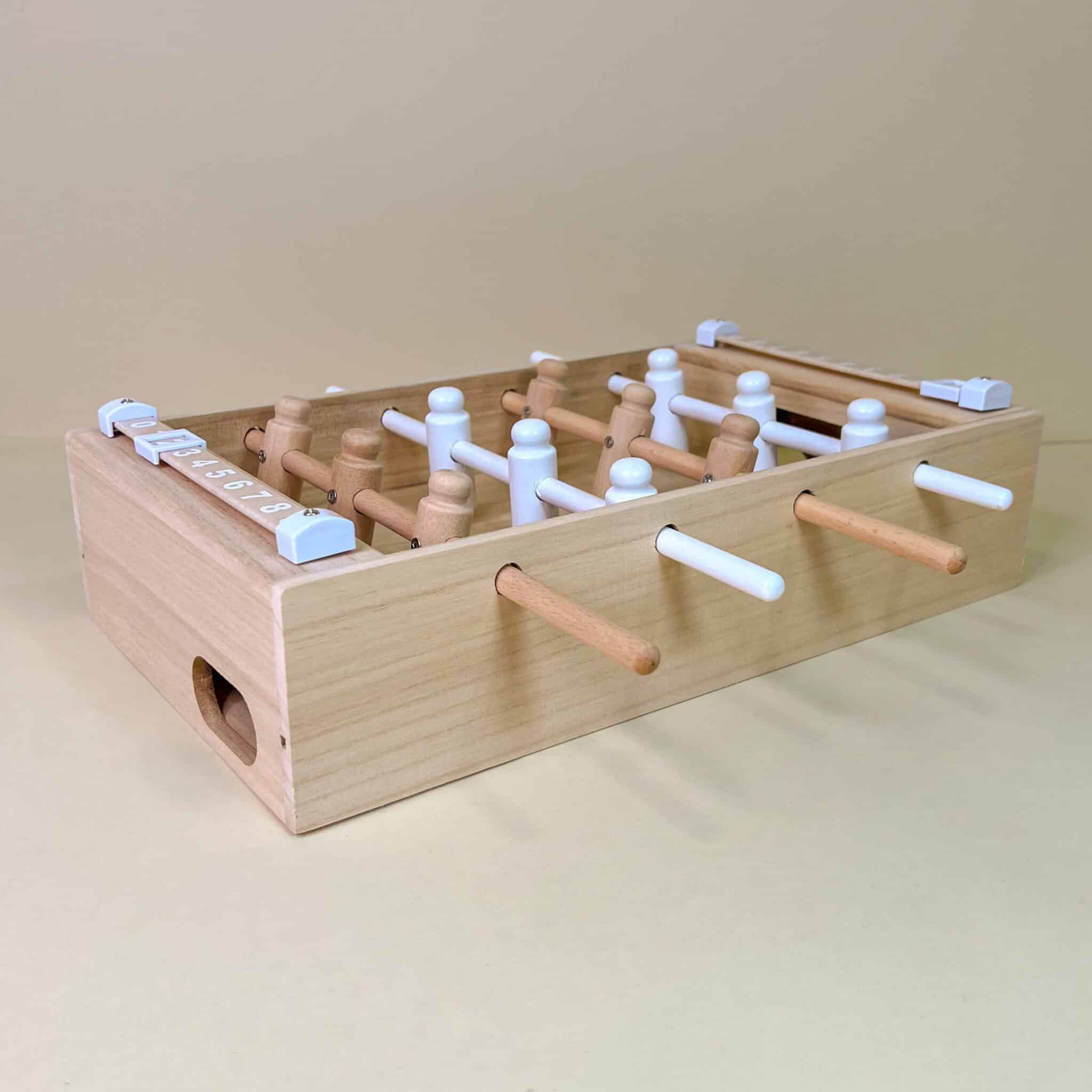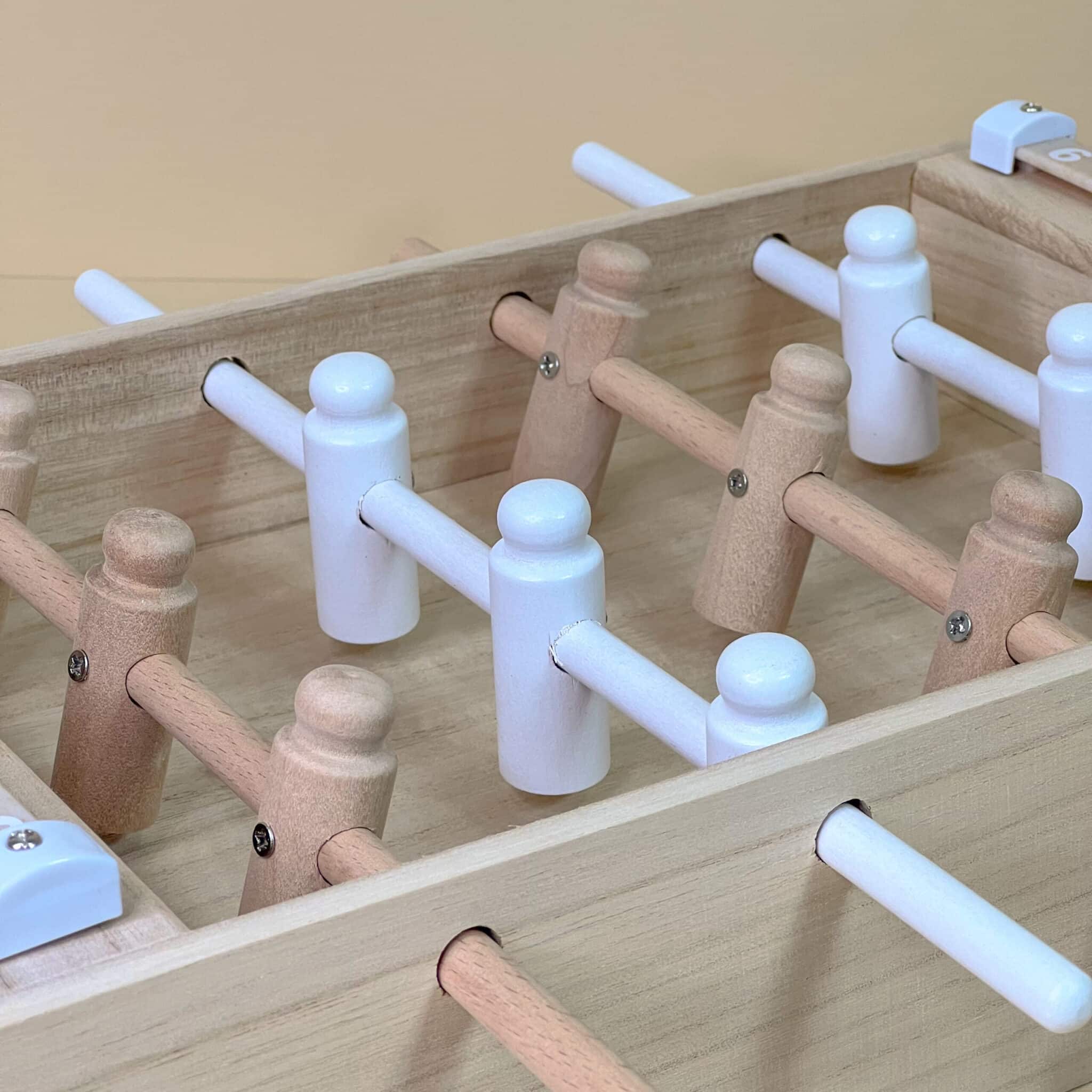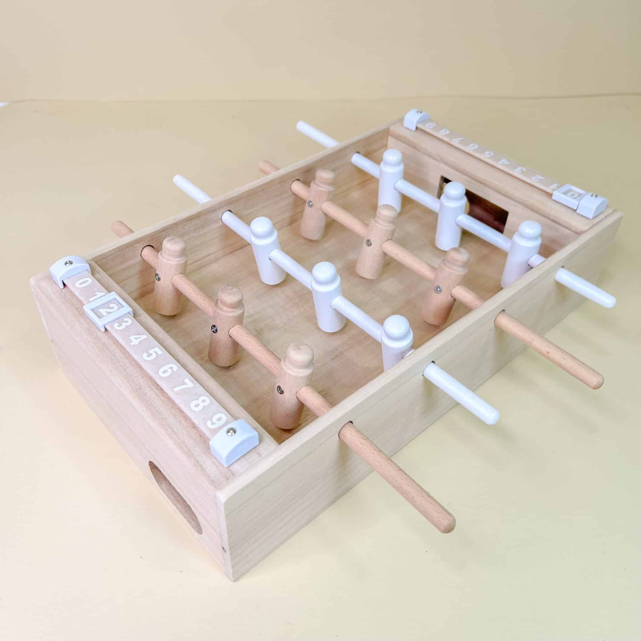Mini calcetto balilla in legno da tavolo per serate con amici.