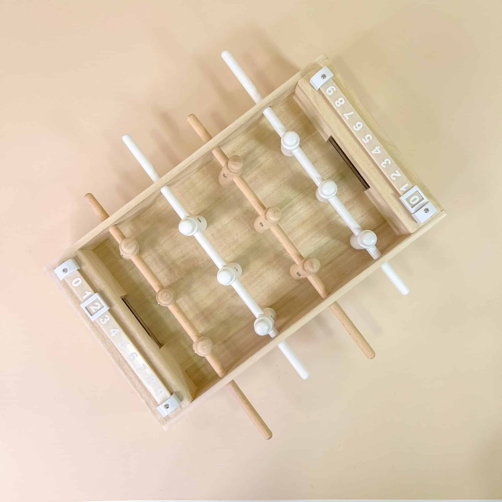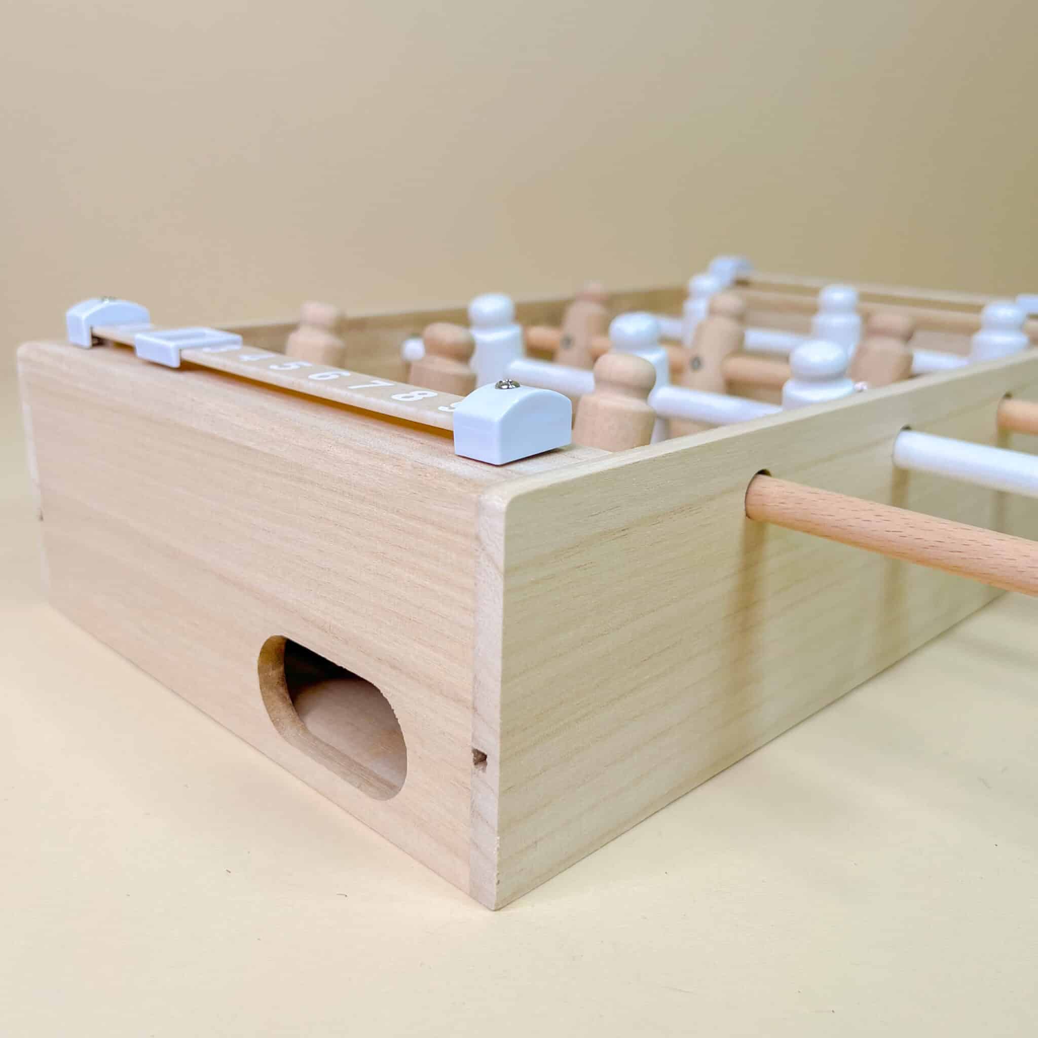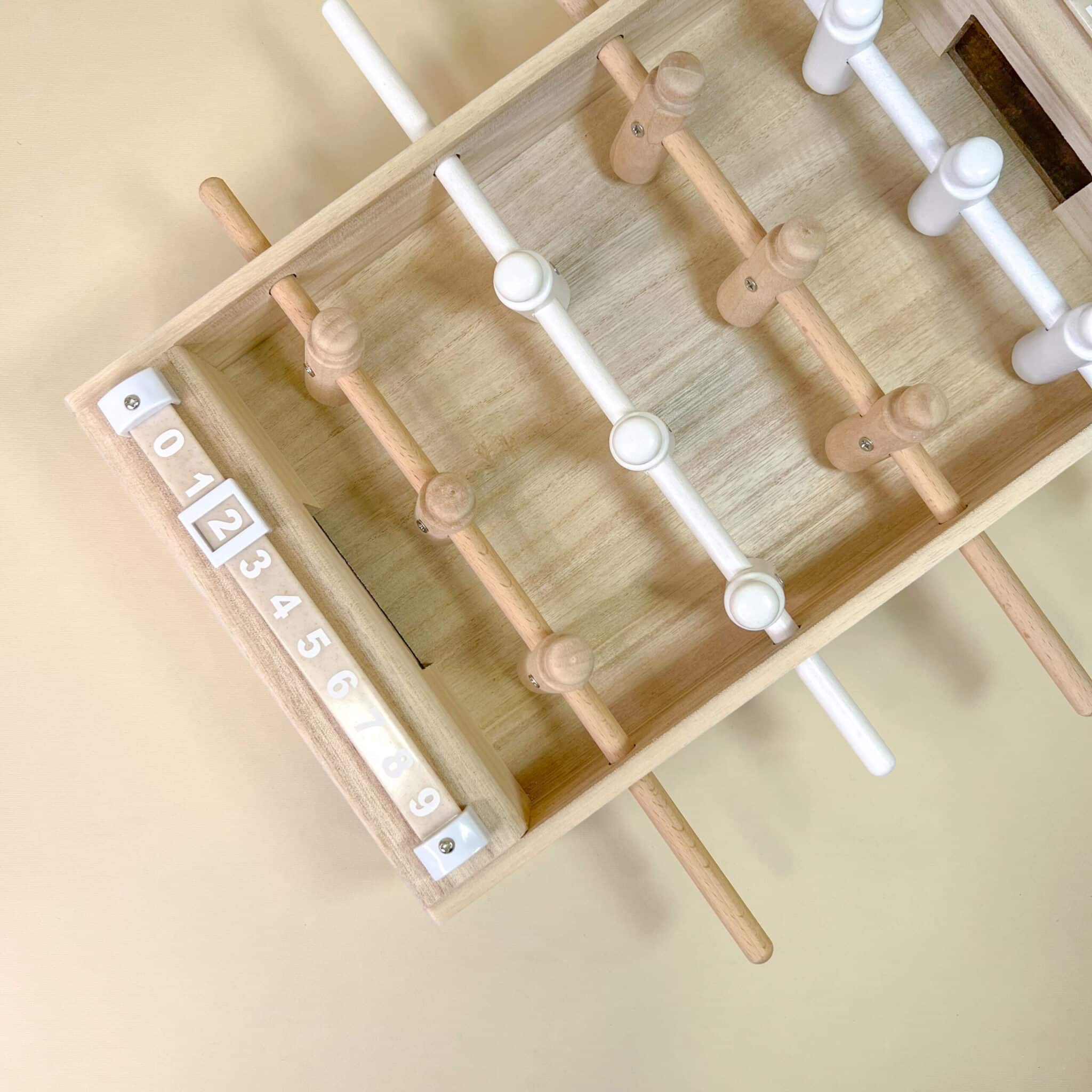 Mini calcetto balilla in legno da tavolo per serate con amici.