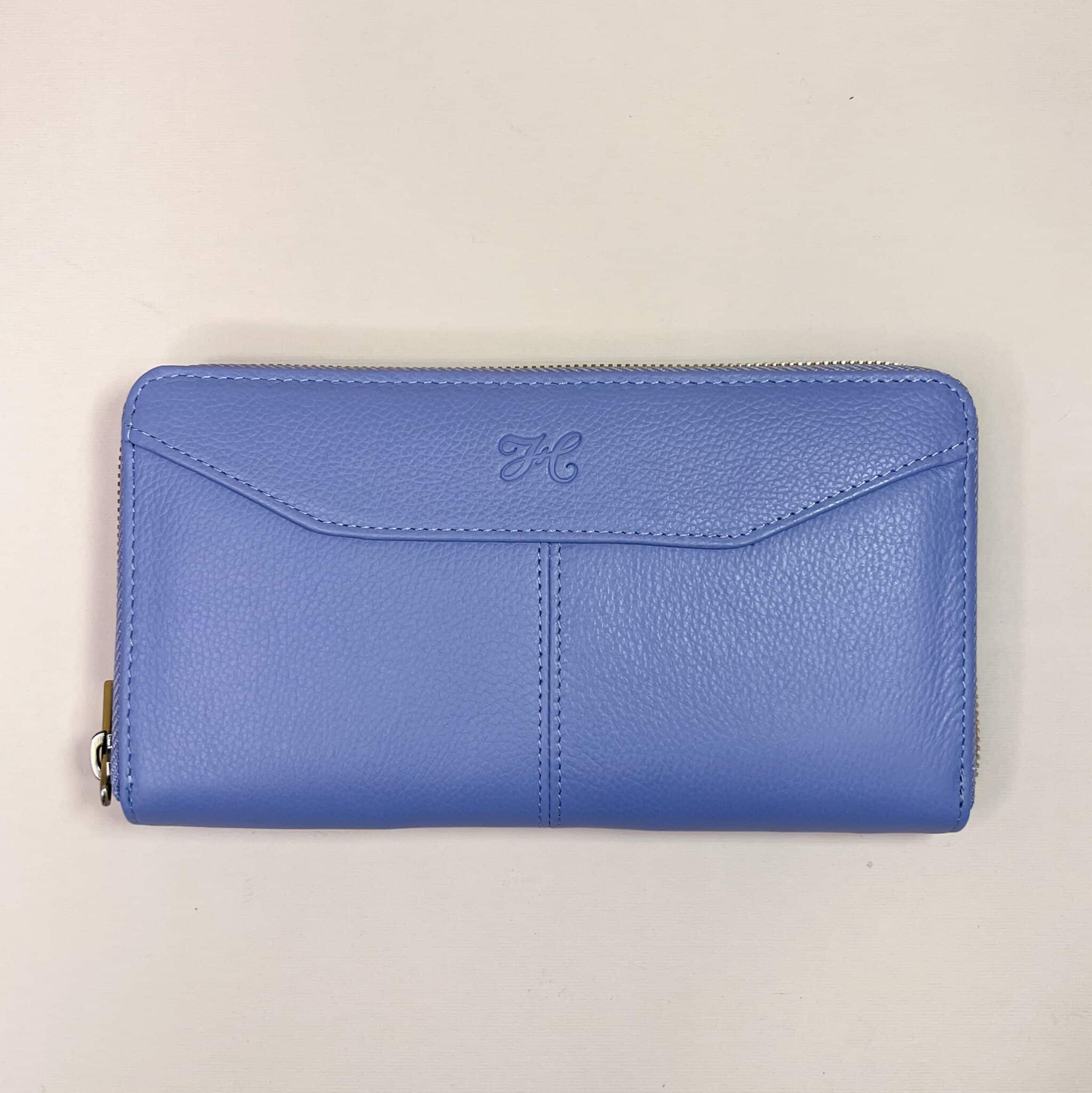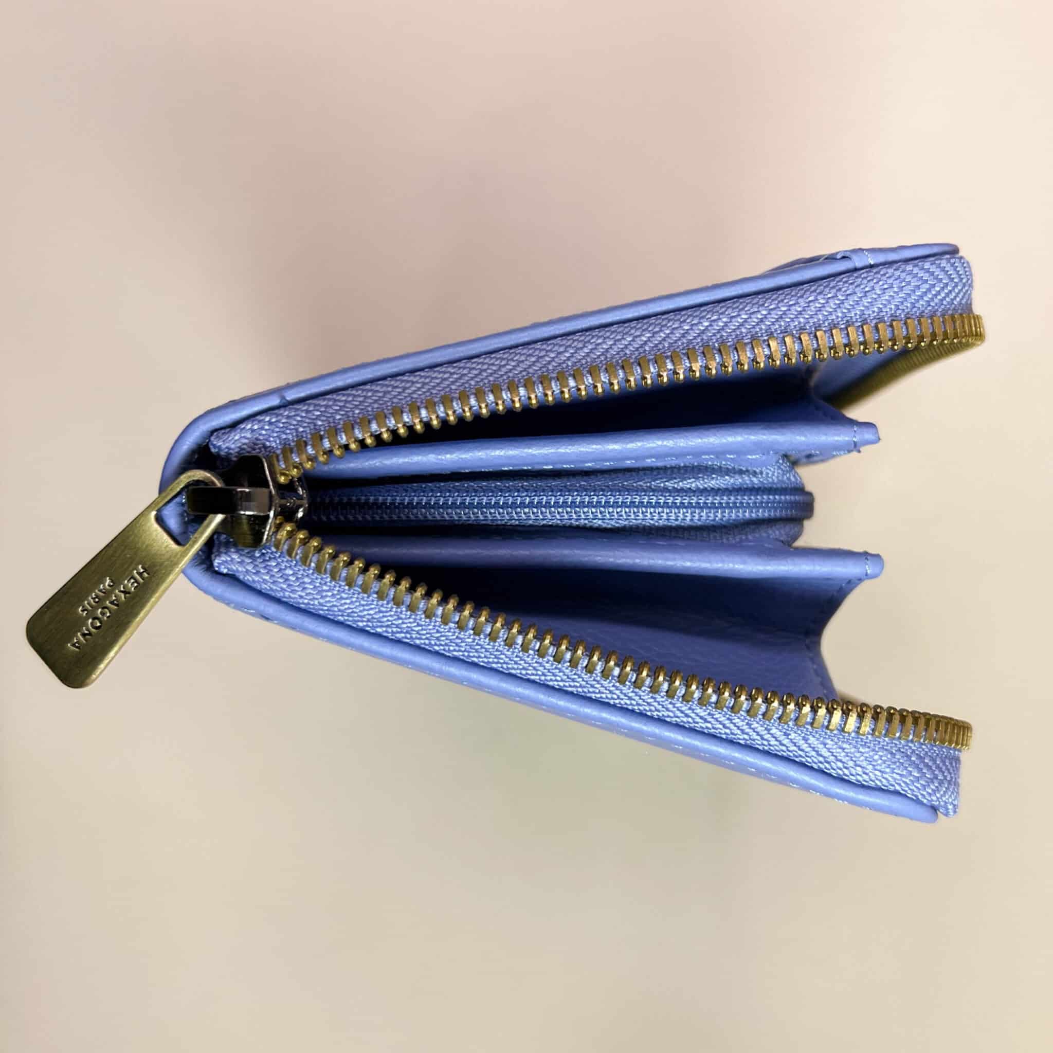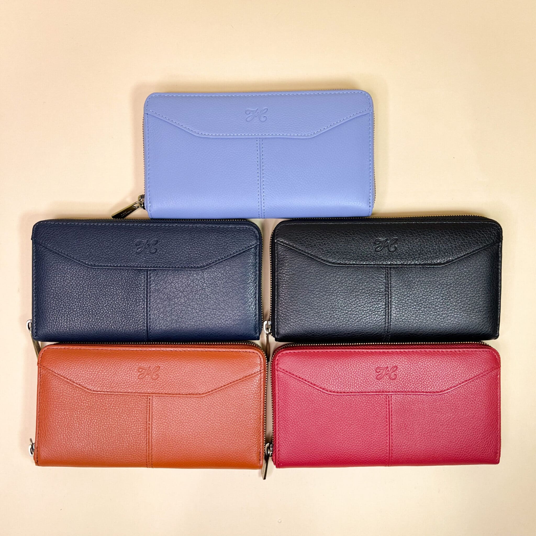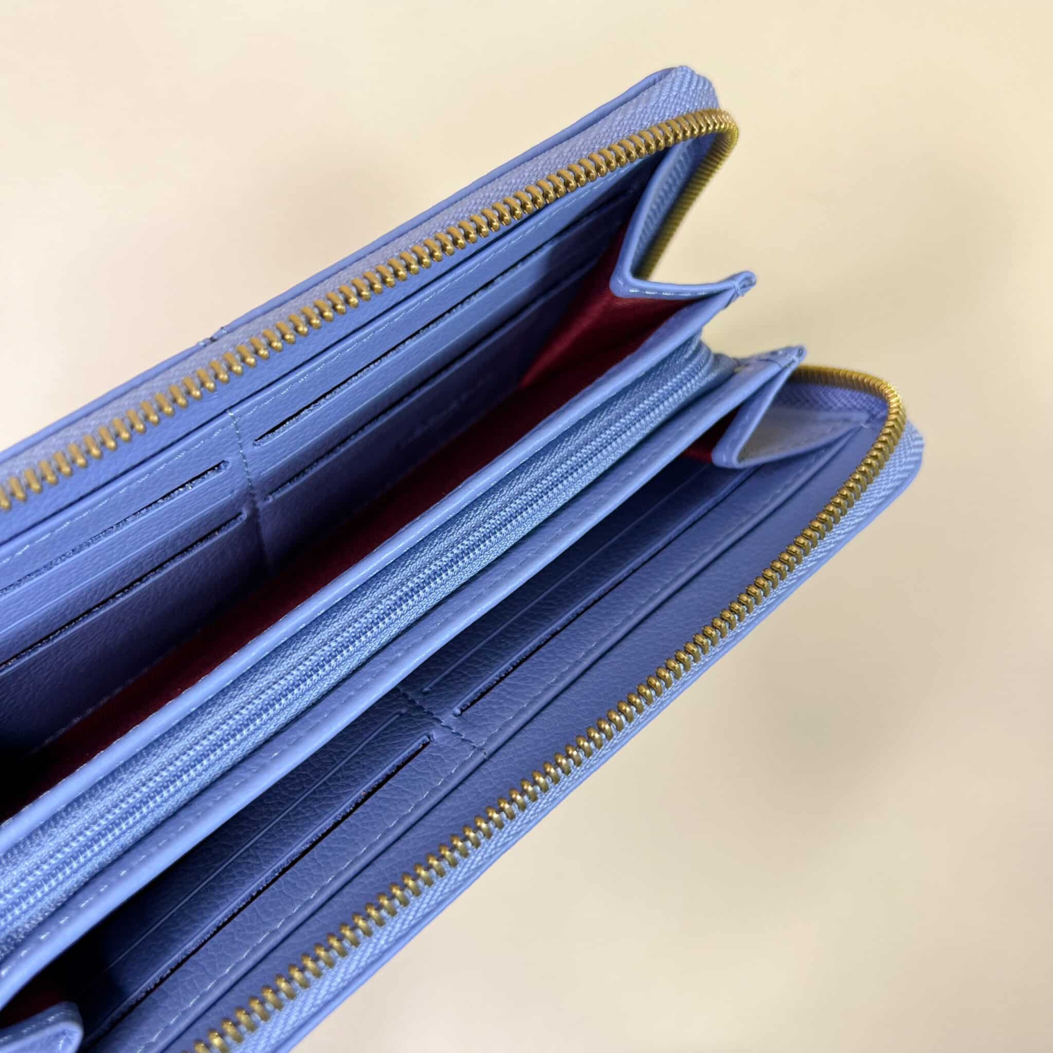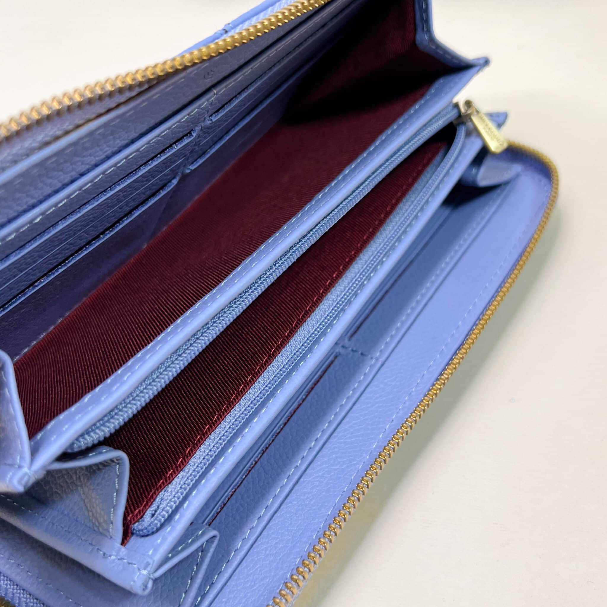Portafoglio in pelle grande da donna con zip, all’interno scomparto per banconote, scomparto con cerniera per monete e spazi per tessere.
