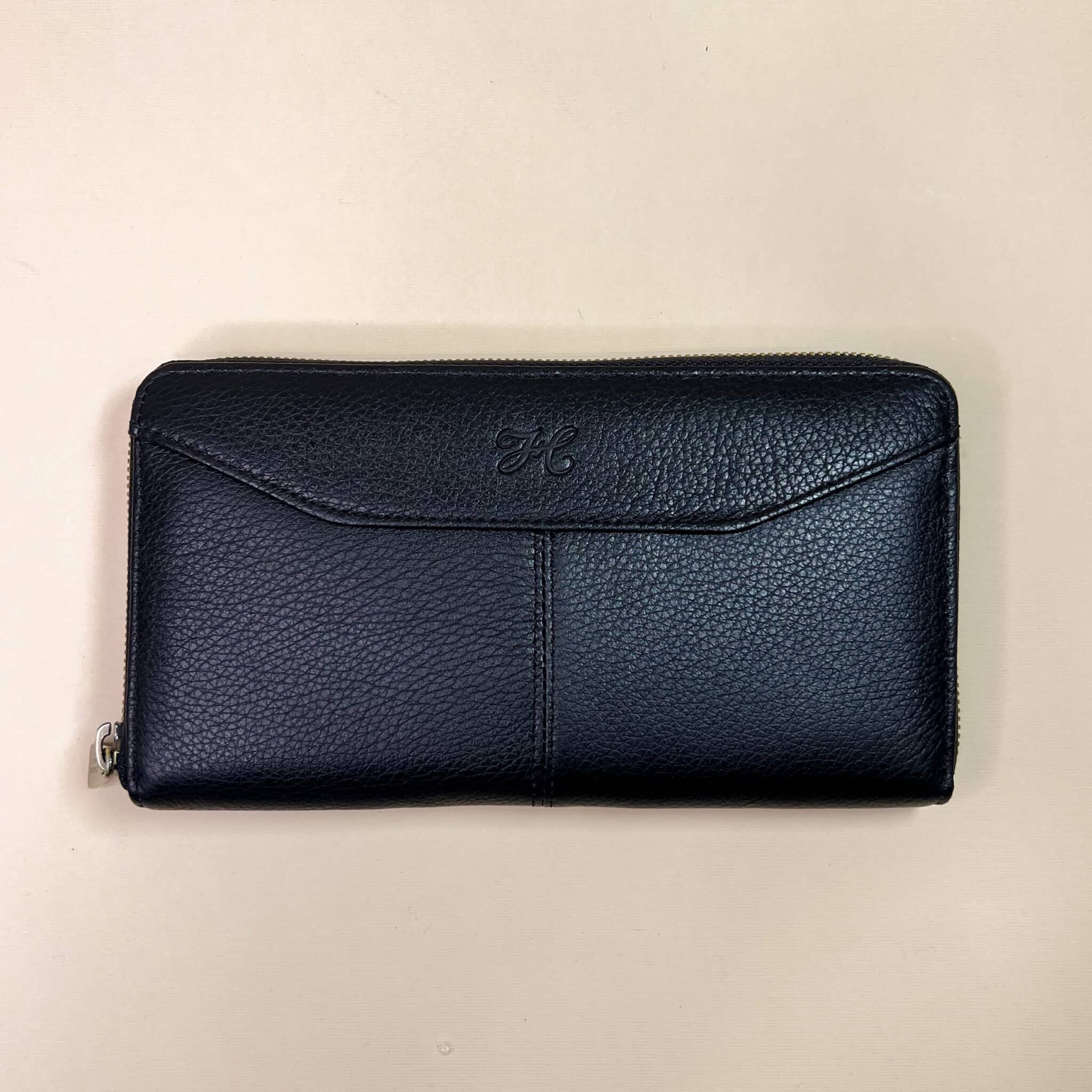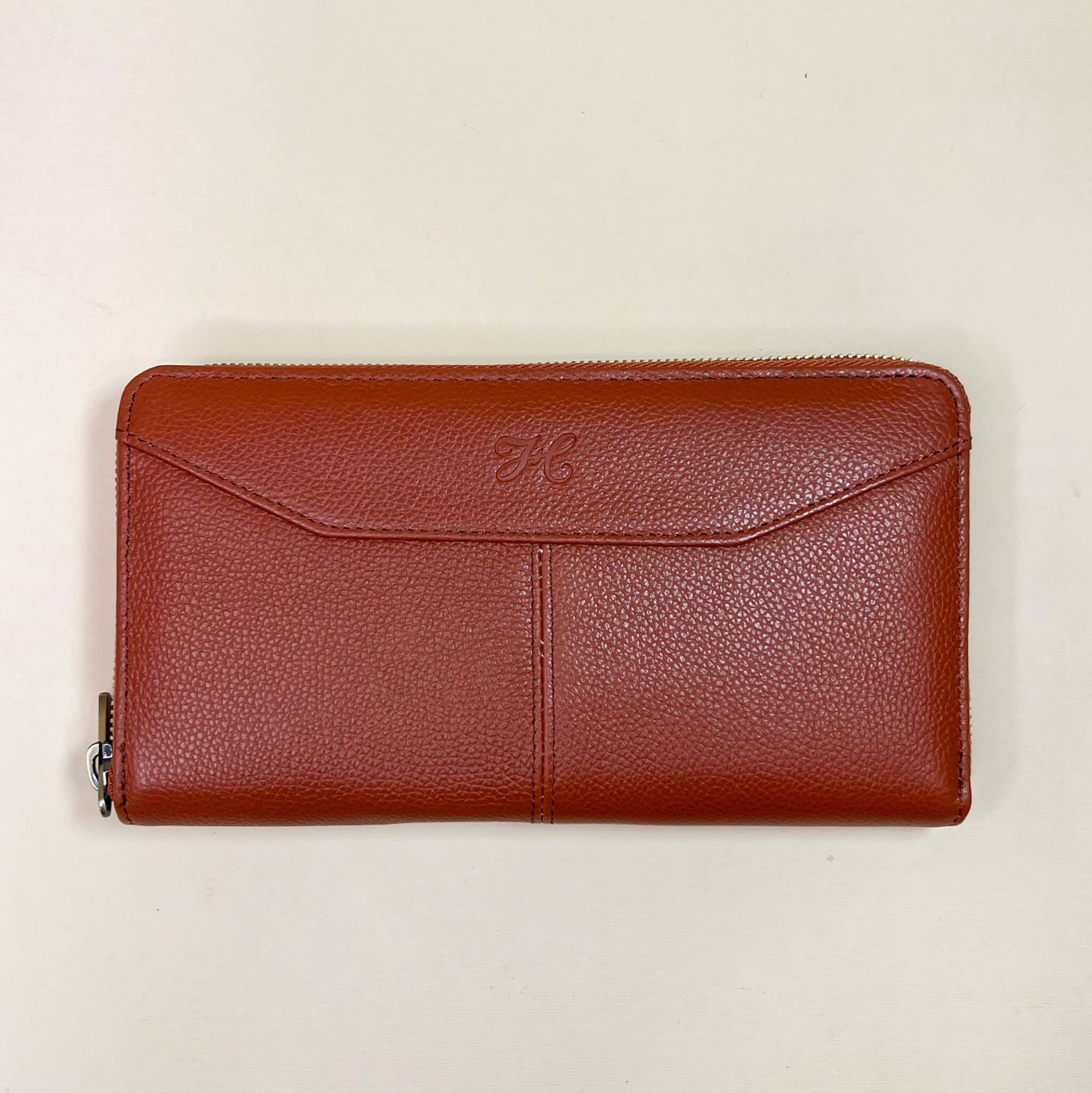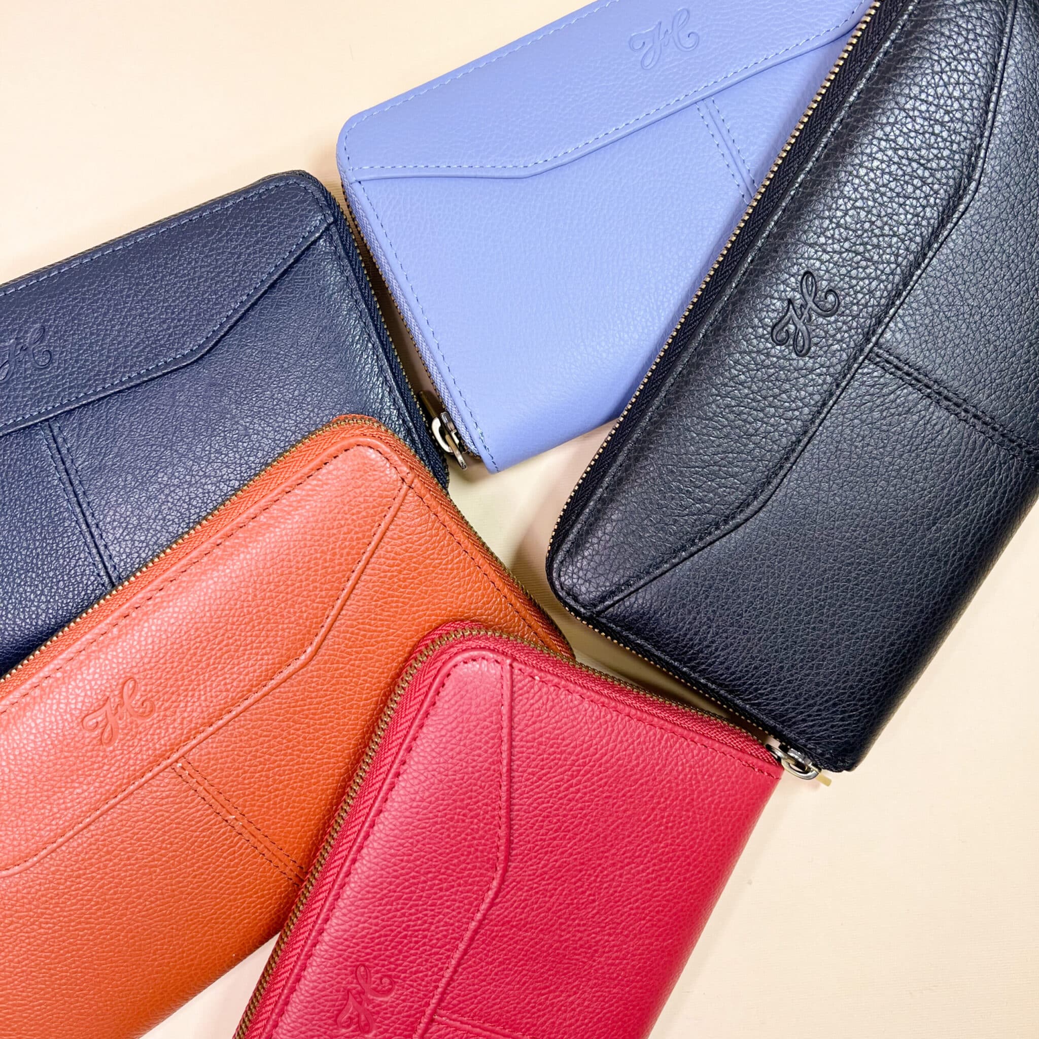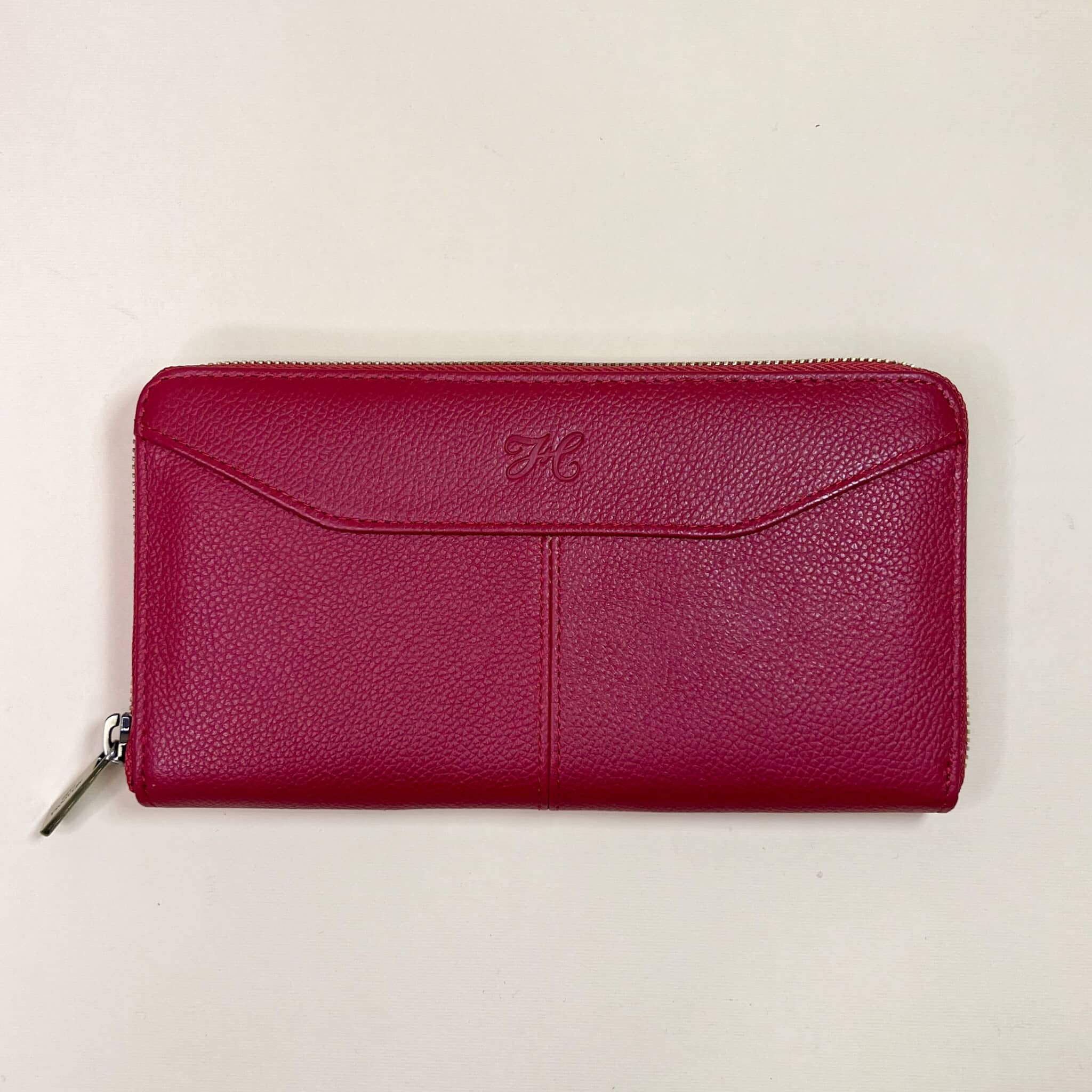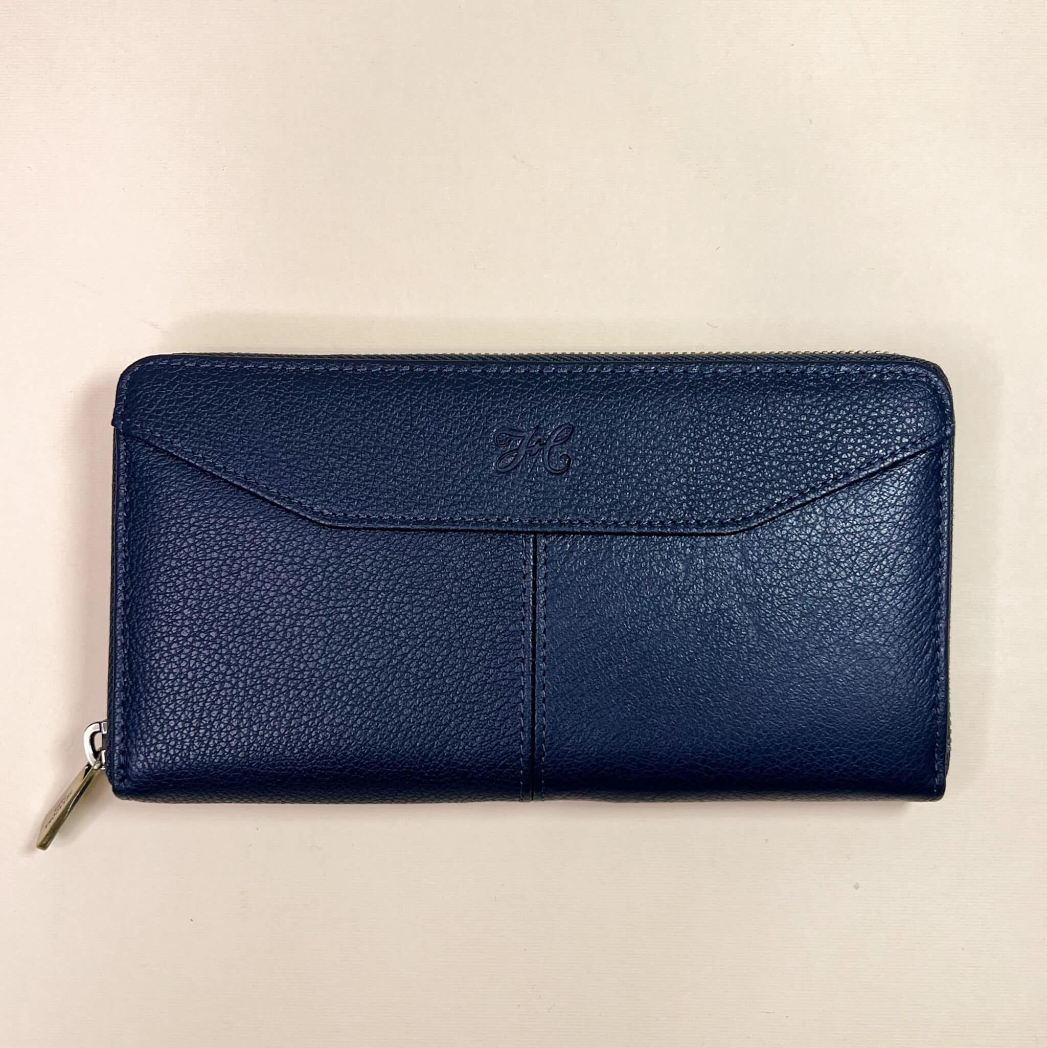 Portafoglio in pelle grande da donna con zip, all’interno scomparto per banconote, scomparto con cerniera per monete e spazi per tessere.