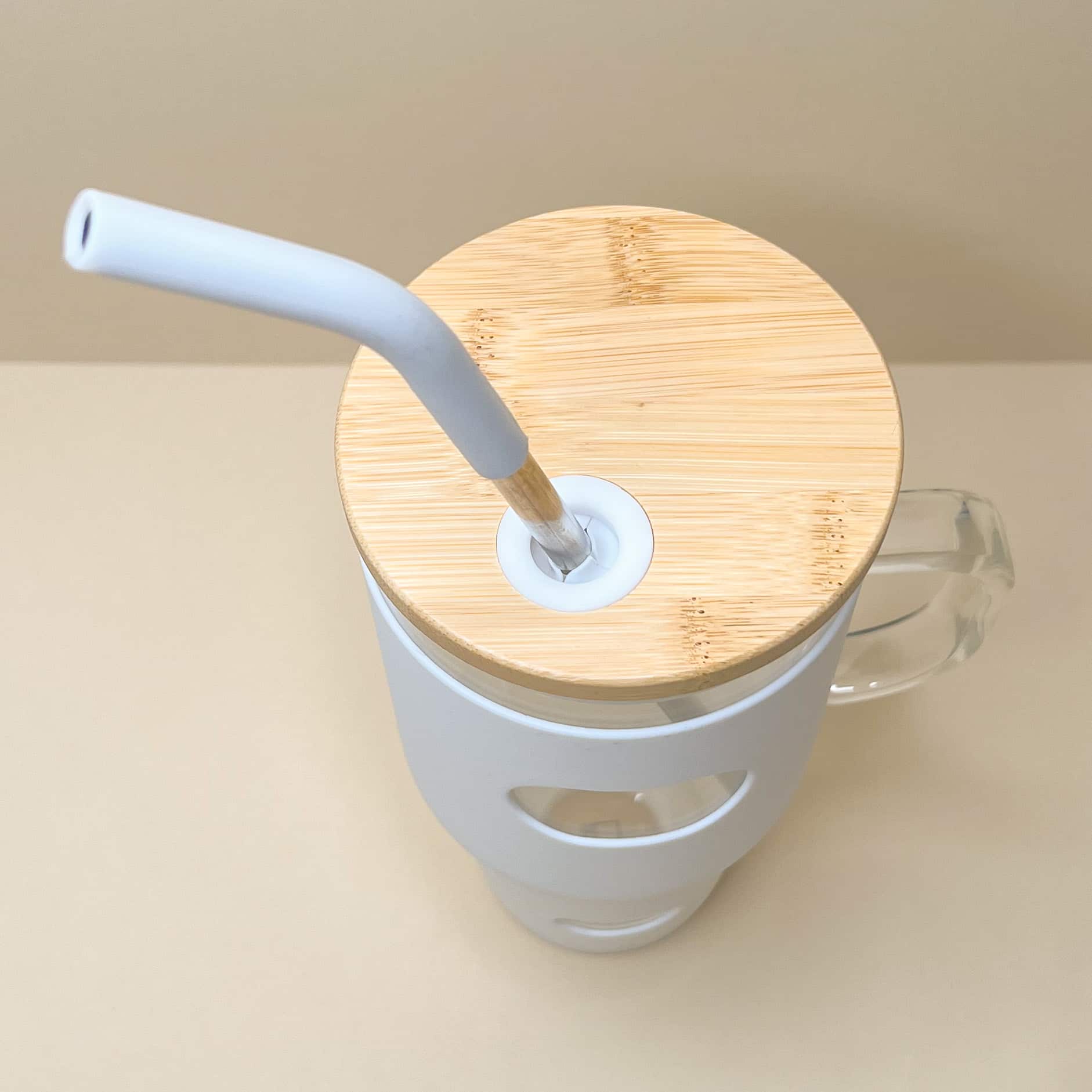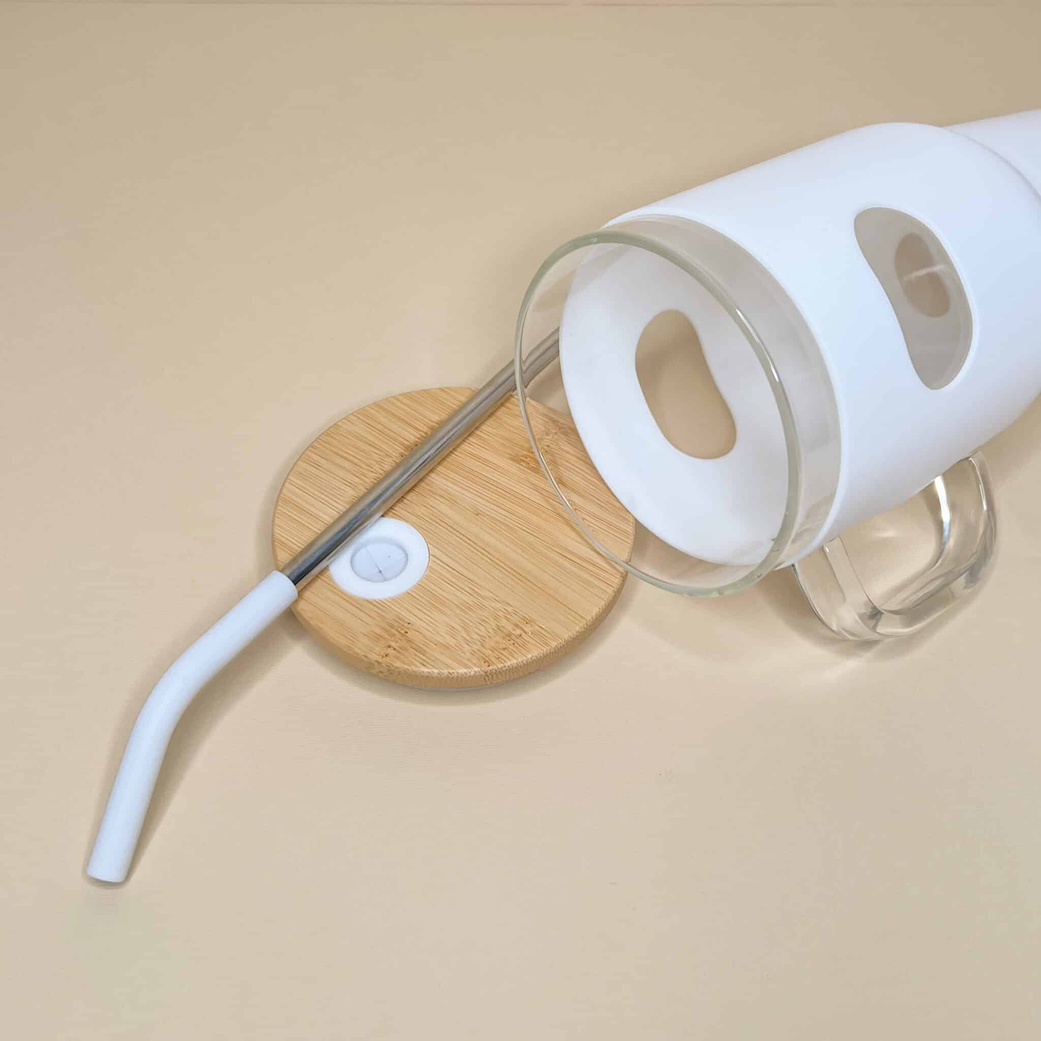 Il contenitore è realizzato in vetro, manico compreso, ed è ricoperto da un involucro in silicone anti scivolamento; il coperchio è realizzato in bamboo e è provvisto di guarnizione anti goccia e foro per la cannuccia; la cannuccia è in acciaio inox e silicone.