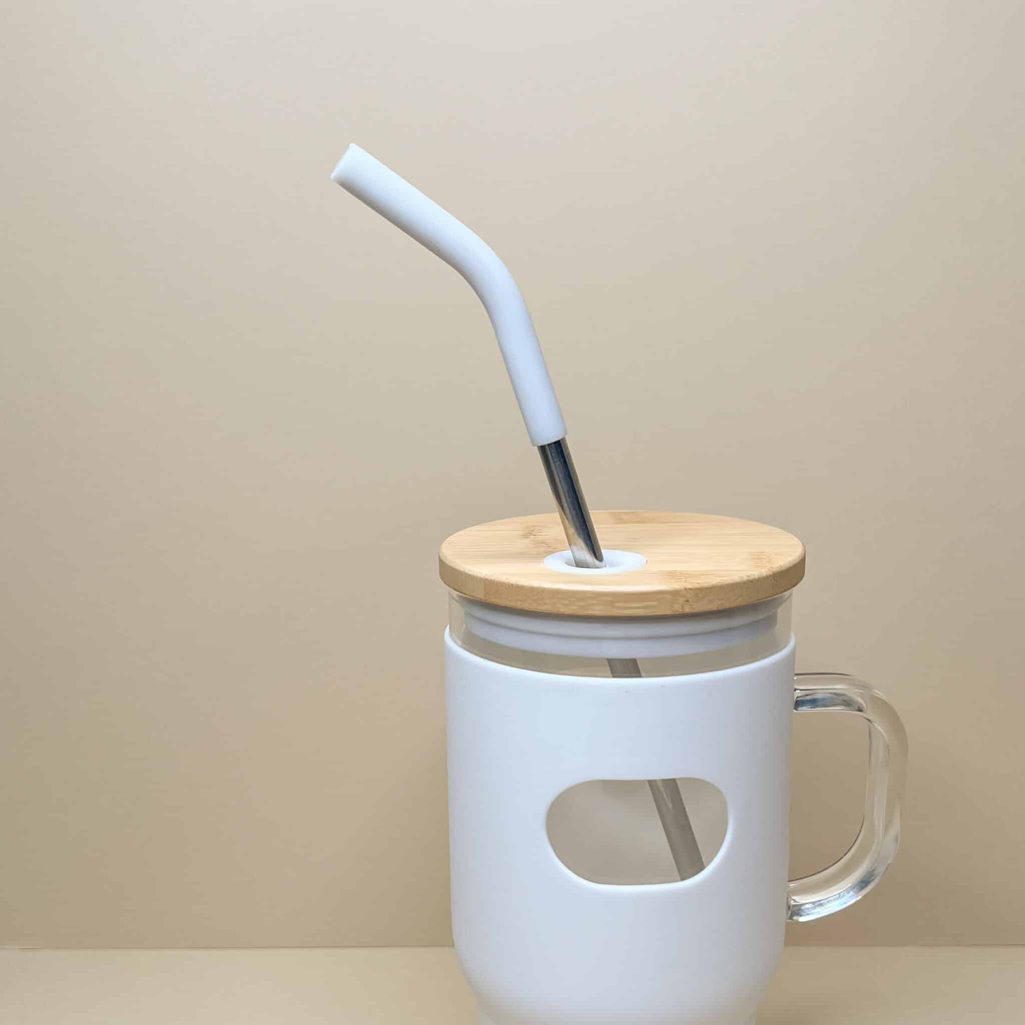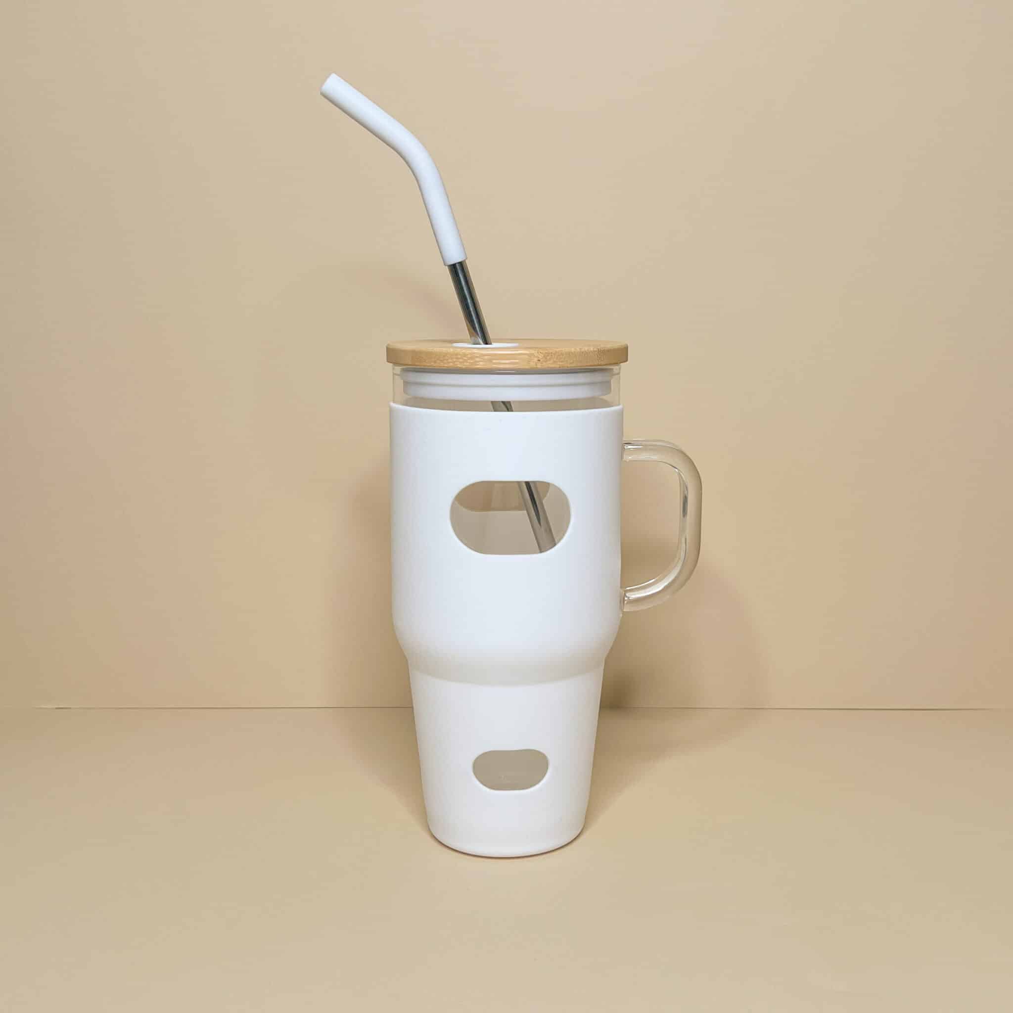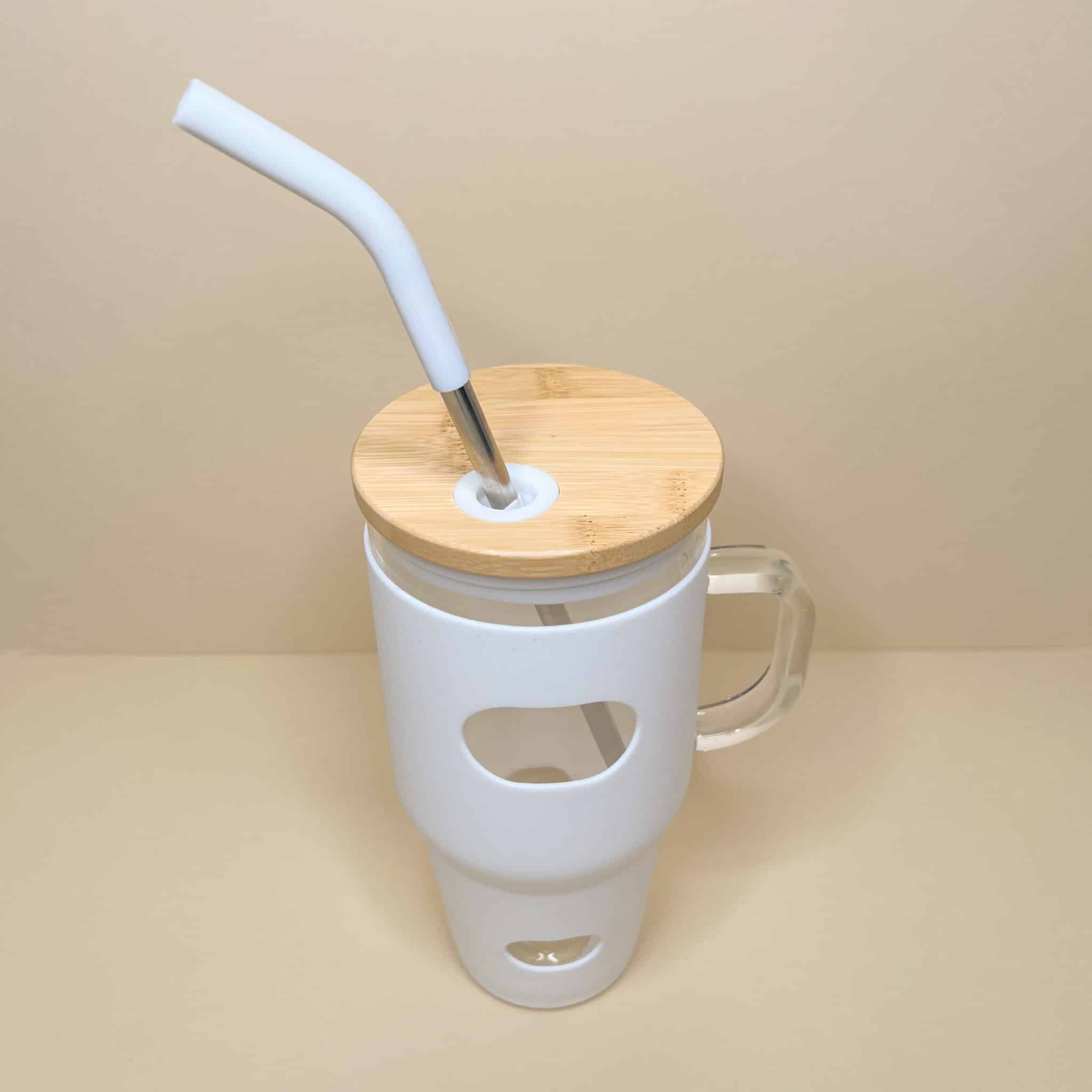 Tazza Bicchiere Borraccia in vetro con rivestimento in silicone con manico capacità 1,1 L con cannuccia in acciaio e beccuccio in silicone.