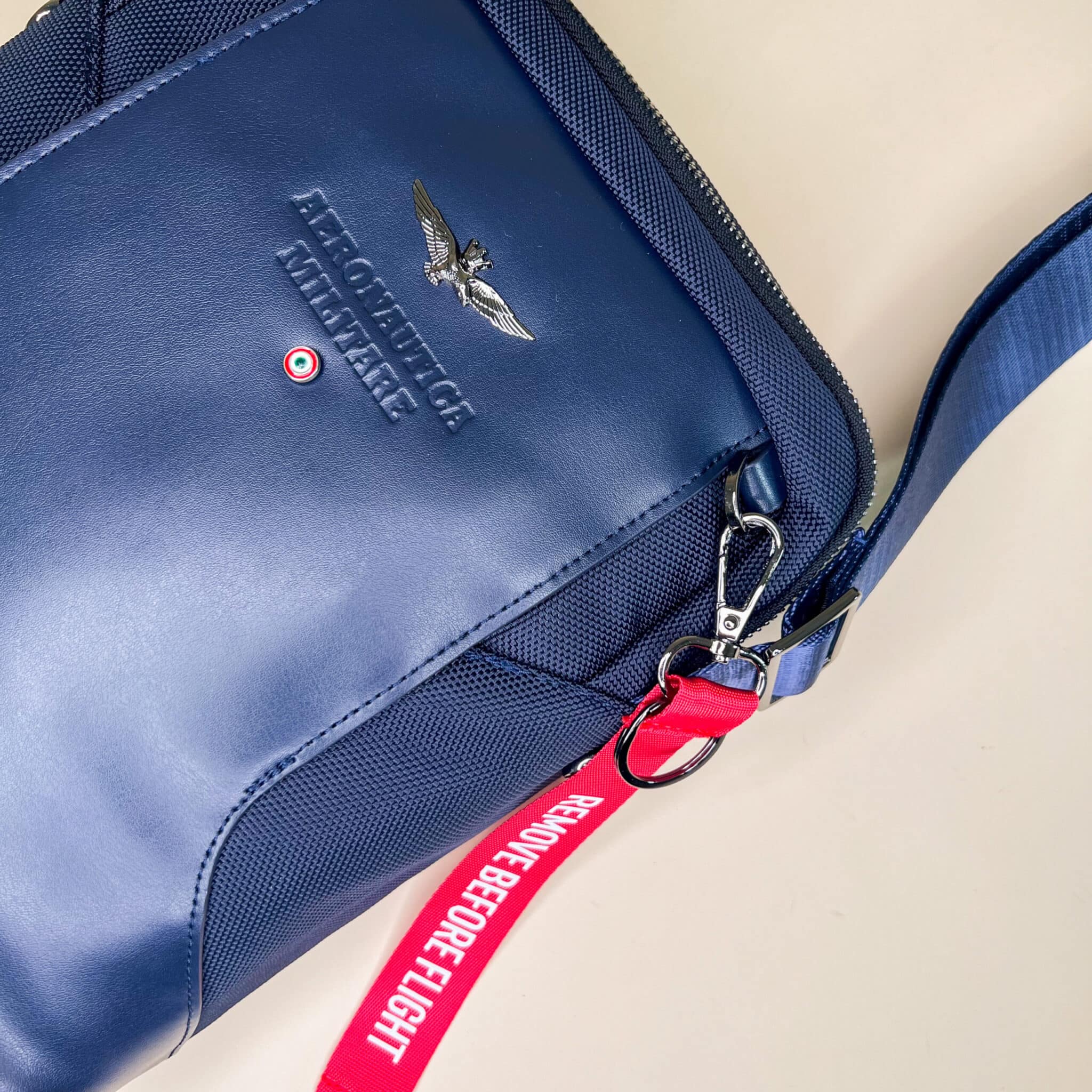 Tracollino Aeronautica militare uomo in tessuto tecnico con dettagli in ecopelle, tasca posteriore e portachiavi.