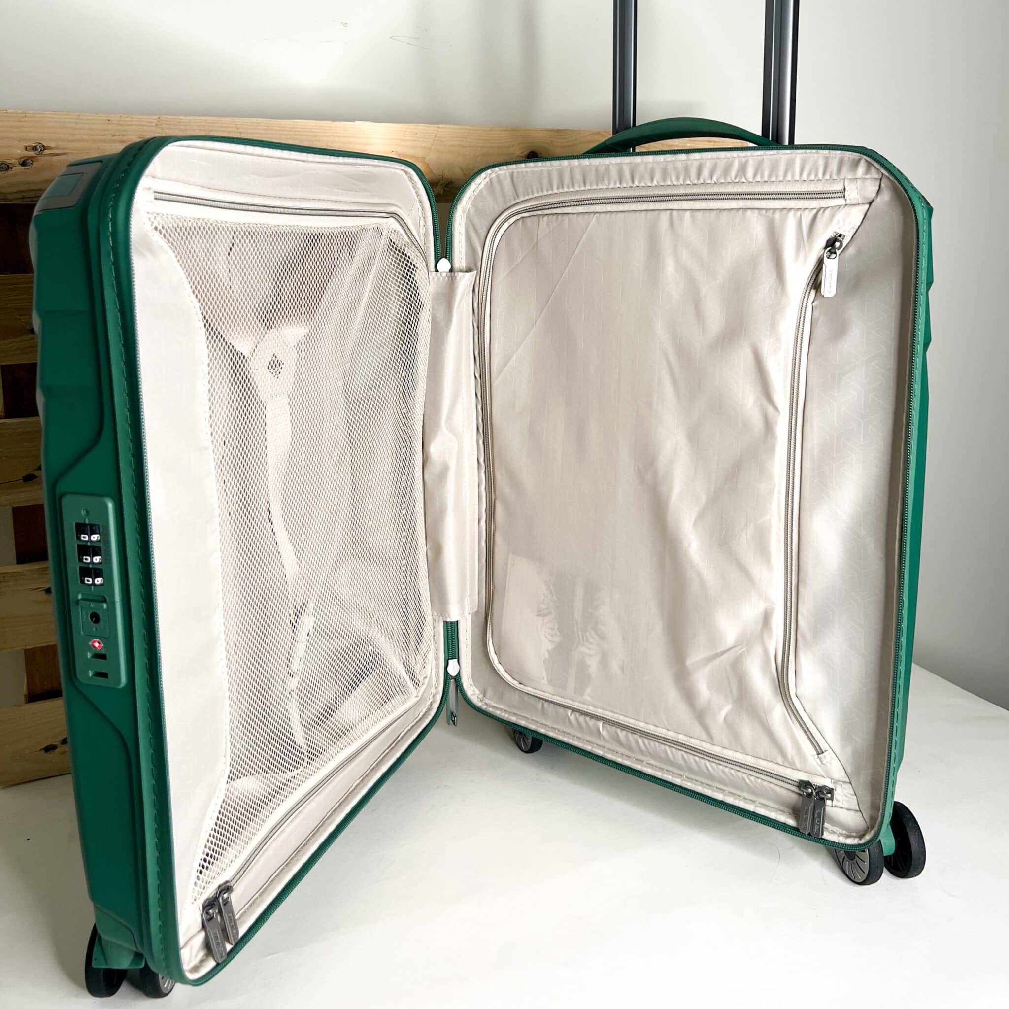 All’interno presenta una fodera in materiale riciclato, divisori interni in tessuto per l’organizzazione ottimale di vestiti e prodotti personali e cinghie porta abiti.